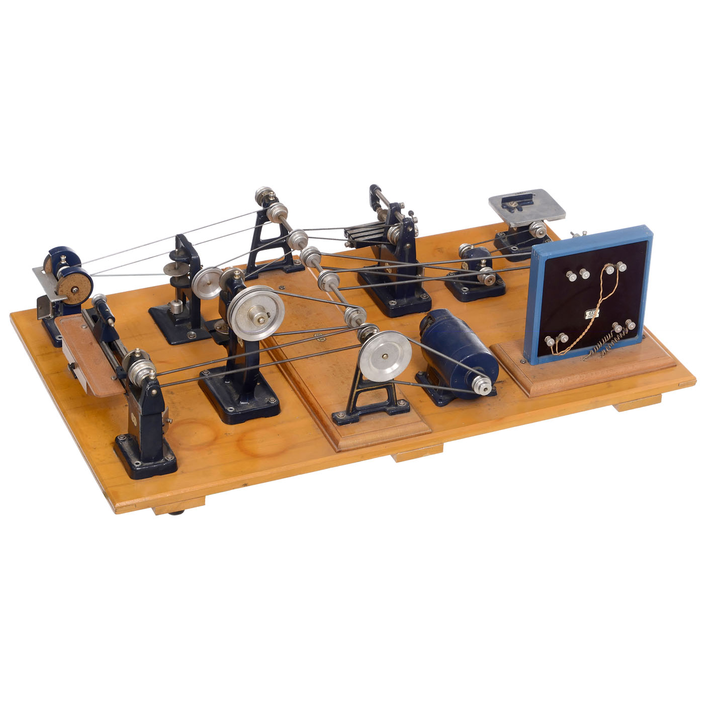 Elektro-Kleintechnik, Dresden, GDR. Working models for use with a steam engine, designed as a teaching model, high-quality workmanship, mostly made of aluminum, consisting of transmission, dynamo, switchboard, bench grinder, circular saw, countershaft, universal milling machine, hammer mill, eccentric press, lathe and double bench grinder, on original E.K.T. wood board, 25 x 14 in.