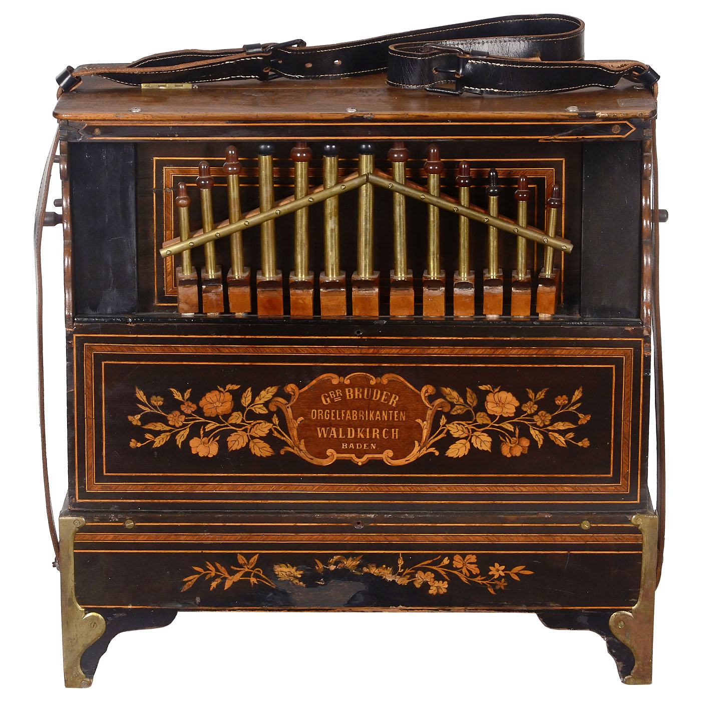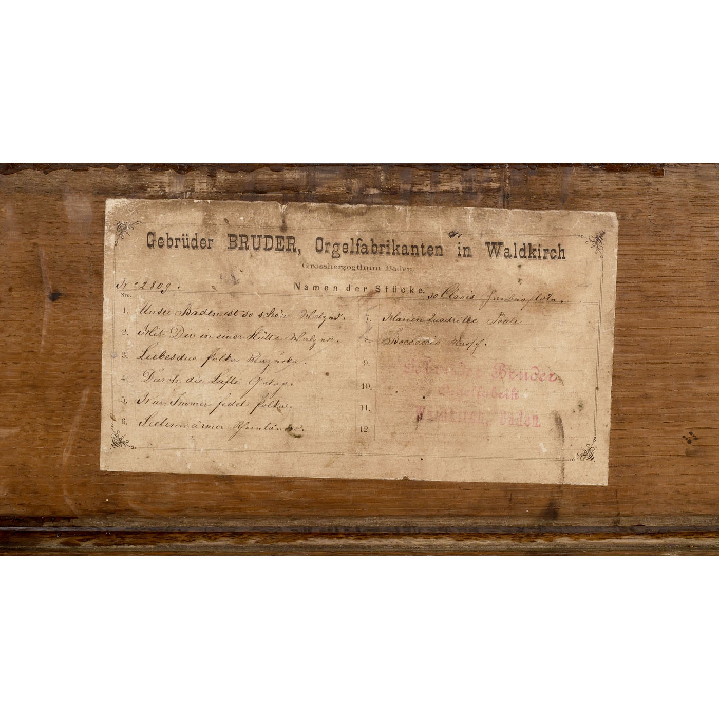 Gebrüder Bruder, Orgelfabrikanten in Waldkirch, Schwarzwald, Germany. No. 2809, with pinned wood barrel playing eight airs, 30 keys, 13 visible piccolo flutes, bass pipes on underside, wood case with original tune-sheet in lid, inlaid front and maker’s name, overall 23 1/5 x 12 ¼ x 23 in., barrel 17 ¾ in., with leather carrying strap, damage to lower inlay, non-playing condition, in need of restoration.