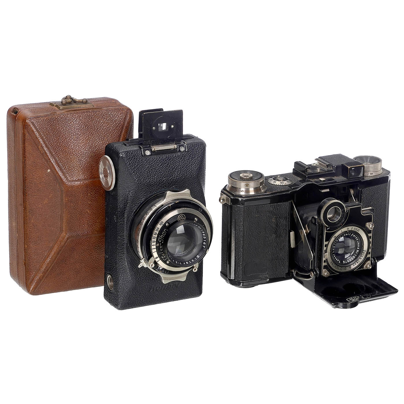 Zeiss Ikon, Dresden. 1) Super Nettel no. Y.30231 with Tessar 2.8/5 cm no. 1458976, with sharp and smooth distance meter, shutter working well, good condition with exception of the usual ‘bumps’ beneath the leather. (3/3) - And: 2) Kolibri no. S.30069, for 3 x 4 cm on 127-film, with Biotar 2/4.5 cm lens no. 1365167 and brown case, shutter slow speeds too fast, in otherwise very good condition. (2-/3)