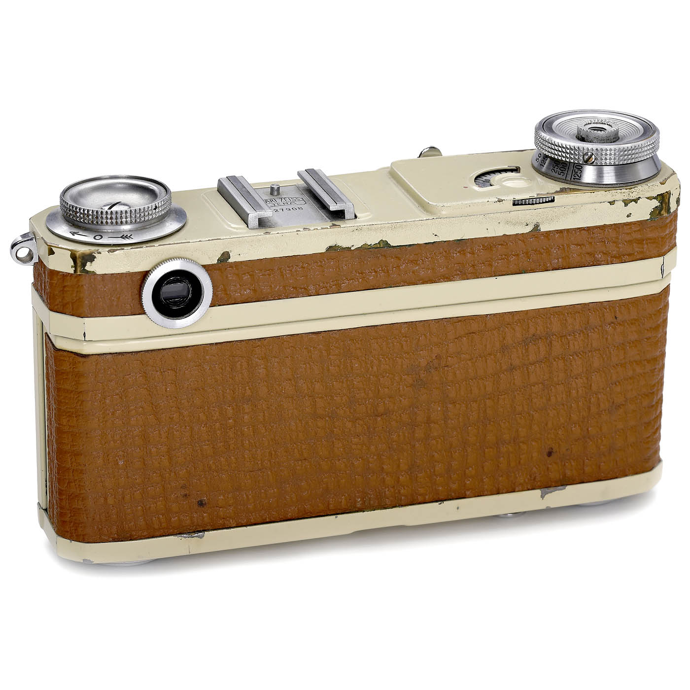 Carl Zeiss, Jena. Contax II no. 27908, with Carl Zeiss Jena Sonnar 2/5 cm T no. 3104703, full working condition, including the self-timer, filter thread with dent, synchronized on the front post 1947. - Note: From recorded Contax ivory-colored cameras (nos. 27917/3107140, 27927/3104794, 27949/3104753, 27960/3104785, 27965/3104755 and 279??/3104774 from the Kuc book), this example bears the earliest number in terms of both the camera and the lenses. The paint (probably intended for medical tools) displays scattered imperfections and a slight wrinkling, a typical feature of the freshly opened paint not being thoroughly stirred and/or the non-chrome-plated (!) brass housing caps not being degreased. With the material shortages of the post-war period, a camera was not so quickly reclassified as sub-quality, thus this first paint sample prototype may have been amongst the first of the Contax ivory-colored camera to have been put into test operation.