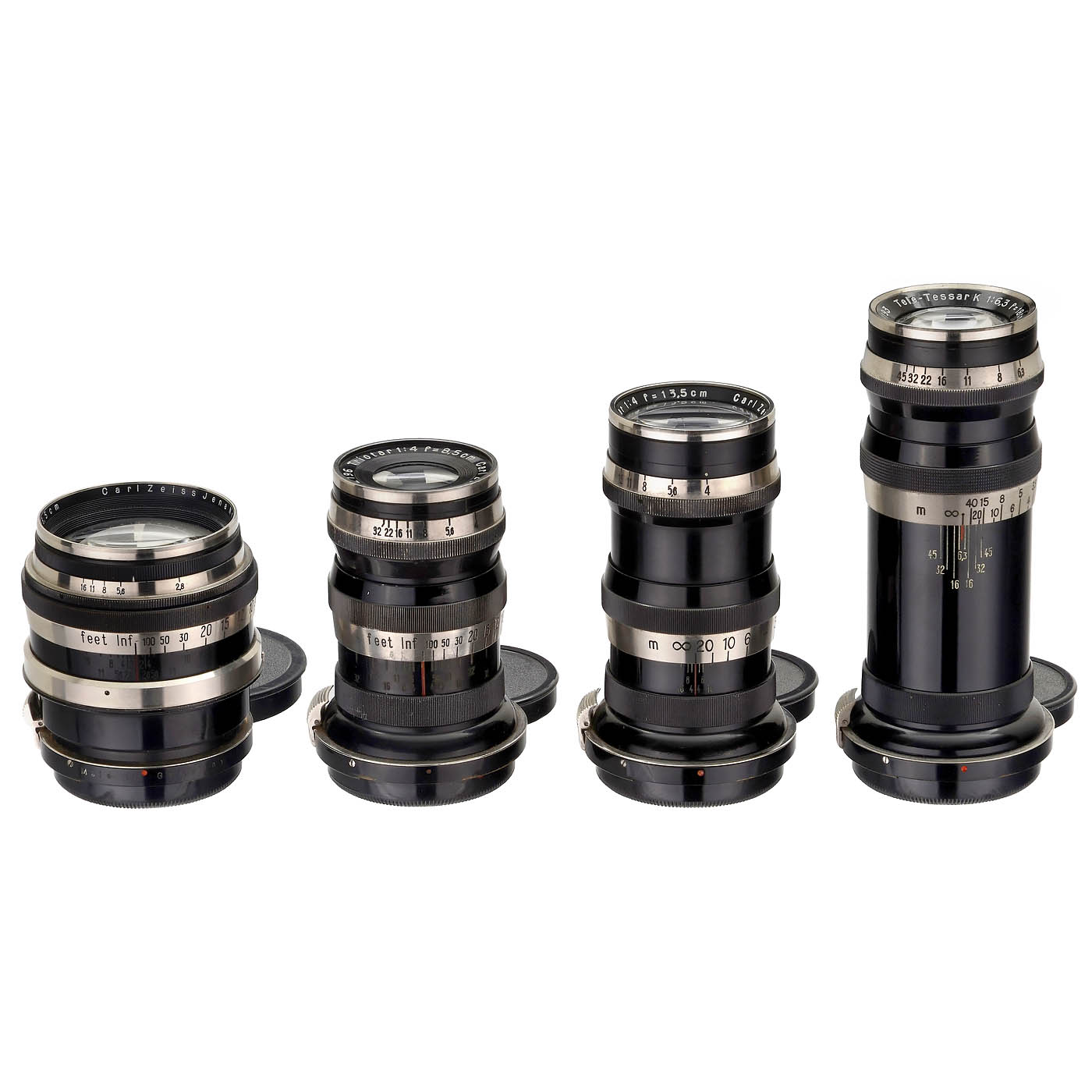 Zeiss Ikon, Dresden. Contax I no. Z 69345, Tessar 3.5/5 cm no. 1270806, Sonnar 2/5 cm no. 1866555, Sonnar 1.5/5 cm no. 1420997, Tessar 8/2.8 cm no. 1420009, Sonnar 2/8.5 cm No. 1503158 feet scale, Triotar 4/8.5 cm no. 1632196 feet scale, Sonnar 4/13.5 cm no. 1435563 and Tele-Tessar K 6.3/18 cm no. 1631193 with viewfinder 436/11, viewfinder 433/26, viewfinder 433/25, turret viewfinder, 4 brown leather pouches and a case. All lenses are in good condition when observed under point light and almost all have front and back caps of the period. The condition of the collection ranges from very good to unused. - In addition: Accessories (in condition 3-4): 8.5 and 18 cm viewfinder, the folding sunshade and the multiple viewfinder 436/4. - The lifetime work of a Contax collector.