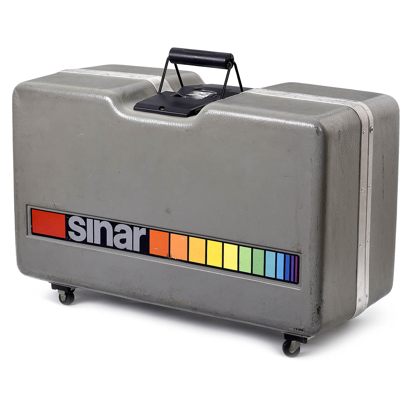 Sinar, Switzerland. 1) Sinar P, 8 x 10 in., two-part base tube 65 cm, with Copal shutter, standard bellows, compendium, focusing screen back, large Sinar wheeled case, 4 unused Lisco 8 x 10 in. double cassettes and 2 unused Calumet 8 x 10 in. double cassettes, shutter working. (3/3) - 2) Schneider Symmar-S 5.6/150 mm in DB mount, glass clean under point light. (3+/2-) - 3) Schneider Super-Angulon 8/90 mm, DB mount, glass clean under point light. (3-/3) - 4) Schneider Symmar 5.6/300 mm, DB mount, interior with some fog. (3/3-) - And: 5) Rodenstock Sironar 5.6/240 mm, DB mount, front lens edge with putty damage (in practice only slight format loss when stopped down). (3/3-)