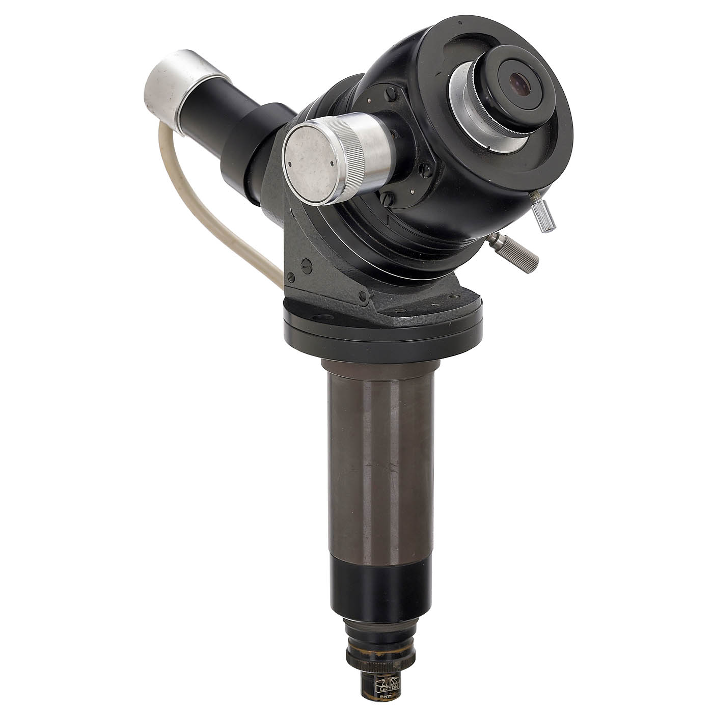 Oberkochen, tube with inclined view, revolver for 4 objectives, large round ball-bearing-mounted cross table, condenser, iris diaphragm, circular base with low-voltage plug-in lamp and Köhler illumination, reflected-light lamp, coarse and fine adjustment on the arm, height 16 ½ in.