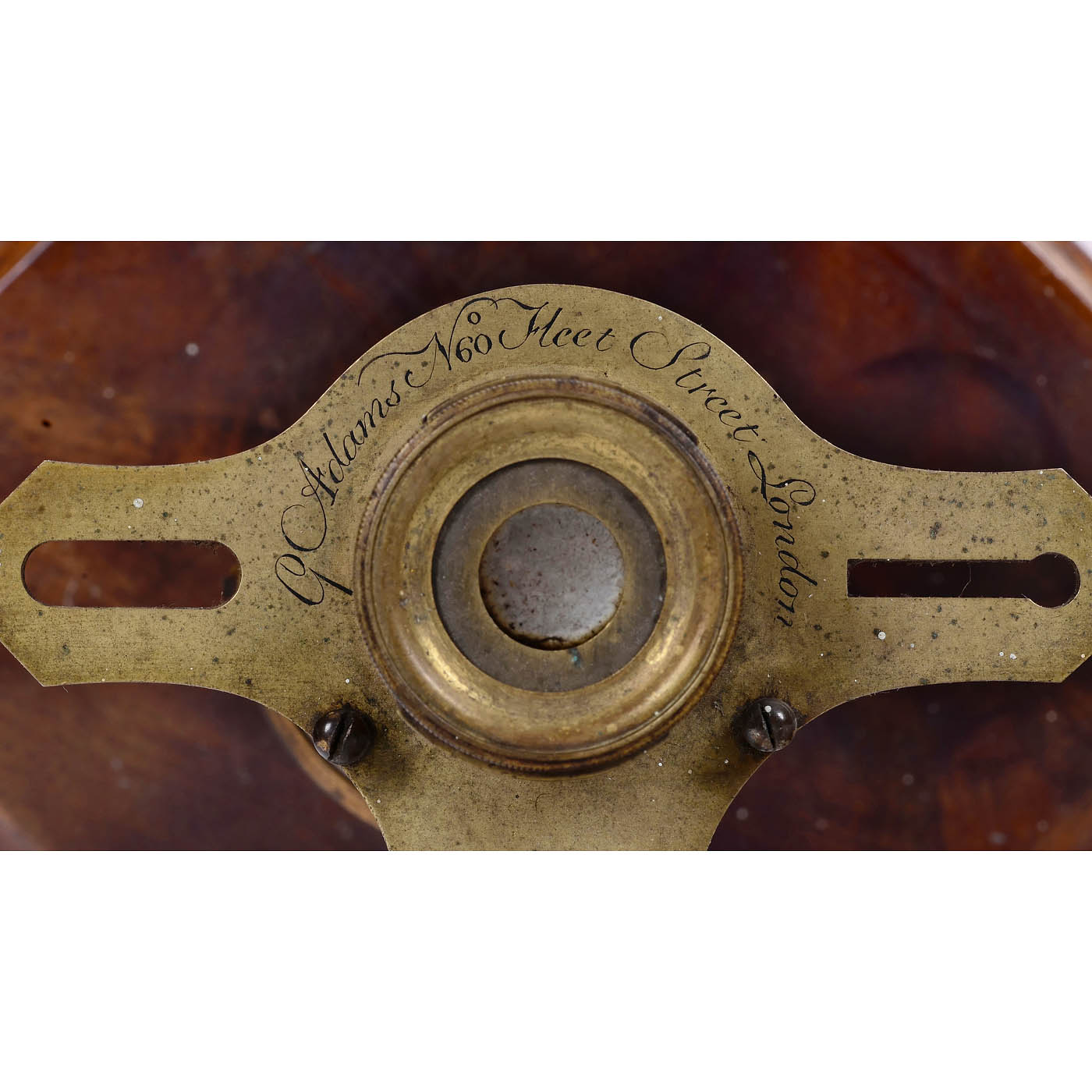Signed: "G. Adams, No. 60 Fleet Street, London", brass microscope with gimbaled 2-inch single mirror, three-arm stage, milled-head screw adjustment to the stage, with threaded mount to rectangular mahogany box base with drawer (6 ¼ x 6 1/4 in.), height without box base 16 1/2 in., with 1 ocular and 5 objective lenses, 1 brass specimen slide, live box, frog plate, bull’s eye lens and forceps.