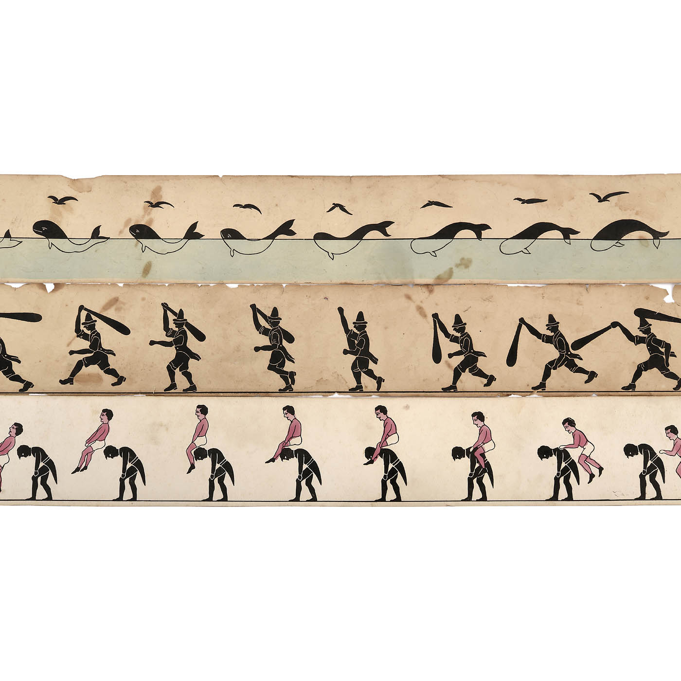 D. Baldwin, Dublin, Ireland. Miracle drum made of hard cardboard with a diameter of 30 cm. Decorative cast-iron base with beautiful ornaments. Device stable and rotates well for a long time. Three strips of paper, two of them printed twice. One of the strips with damage to the edges, but playable. Slight soiling. Moving joke images. Animated "film illusion" before the invention of cinematography.