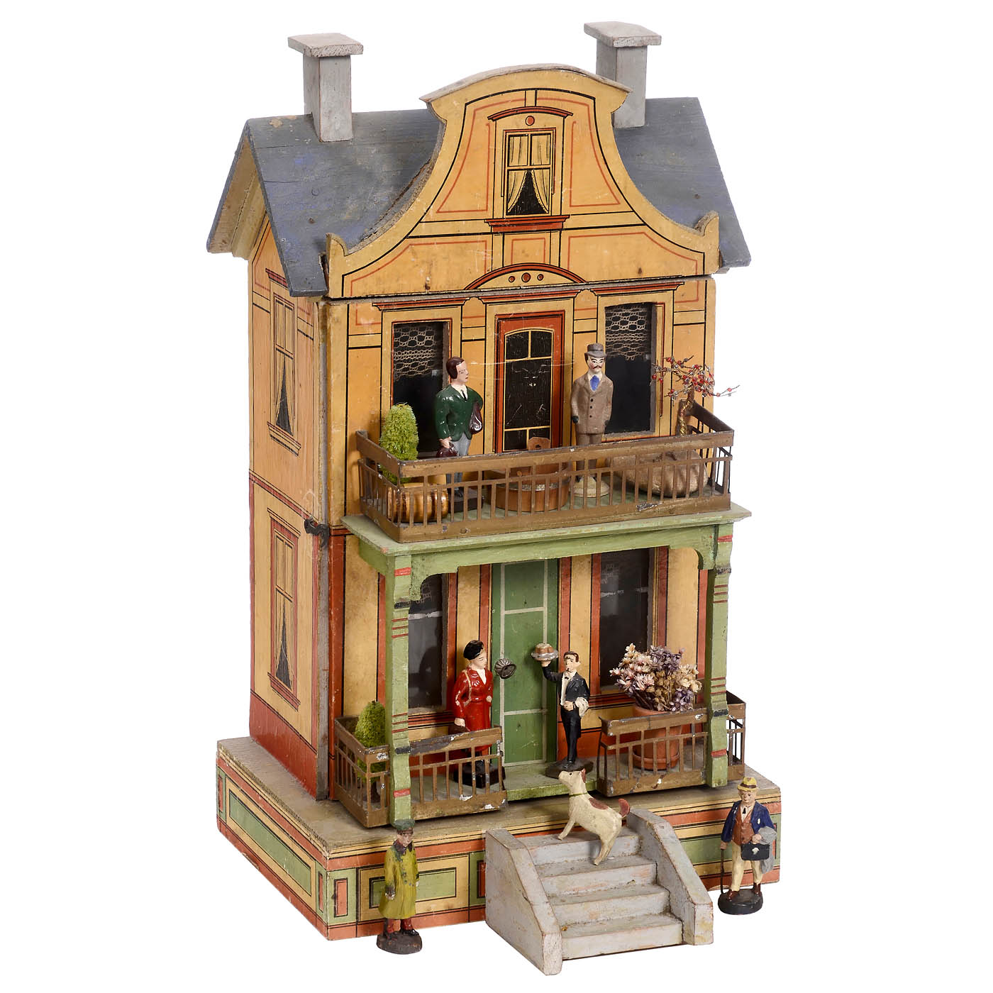 Town villa with blue roof and gabled dormer, wood construction with lithographic exteriors, 2 floors with 2 rooms, glazed windows with curtains, wallpaper, opening door, open veranda and balcony with decoration, three-part fence and 19 figures (not all appropriate for the doll's house). Overall: 10 1/5 x 11 x 14 ¾ in. - A rarely found doll's house. - Literature: "Moritz Gottschalk 1892-1931", Cieslik Verlag 2000.