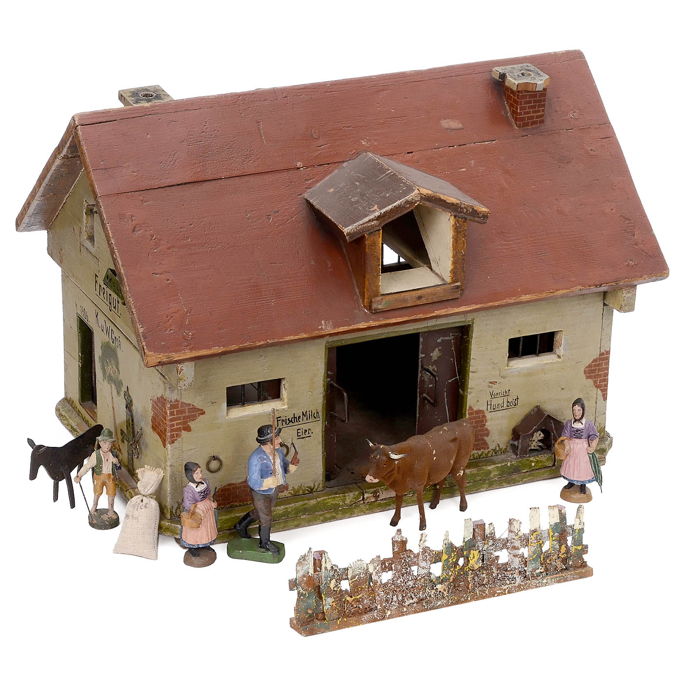 Stable building, wood, hand-painted, 4 sliding doors, many details, removable roof, total dimensions 21 2/3 x 14 ½ x 15 3/5 in., 36 figures (farmers, chickens, pigeons, horses, cows and other animals), manufactured by Elastolin, Lineol and others.