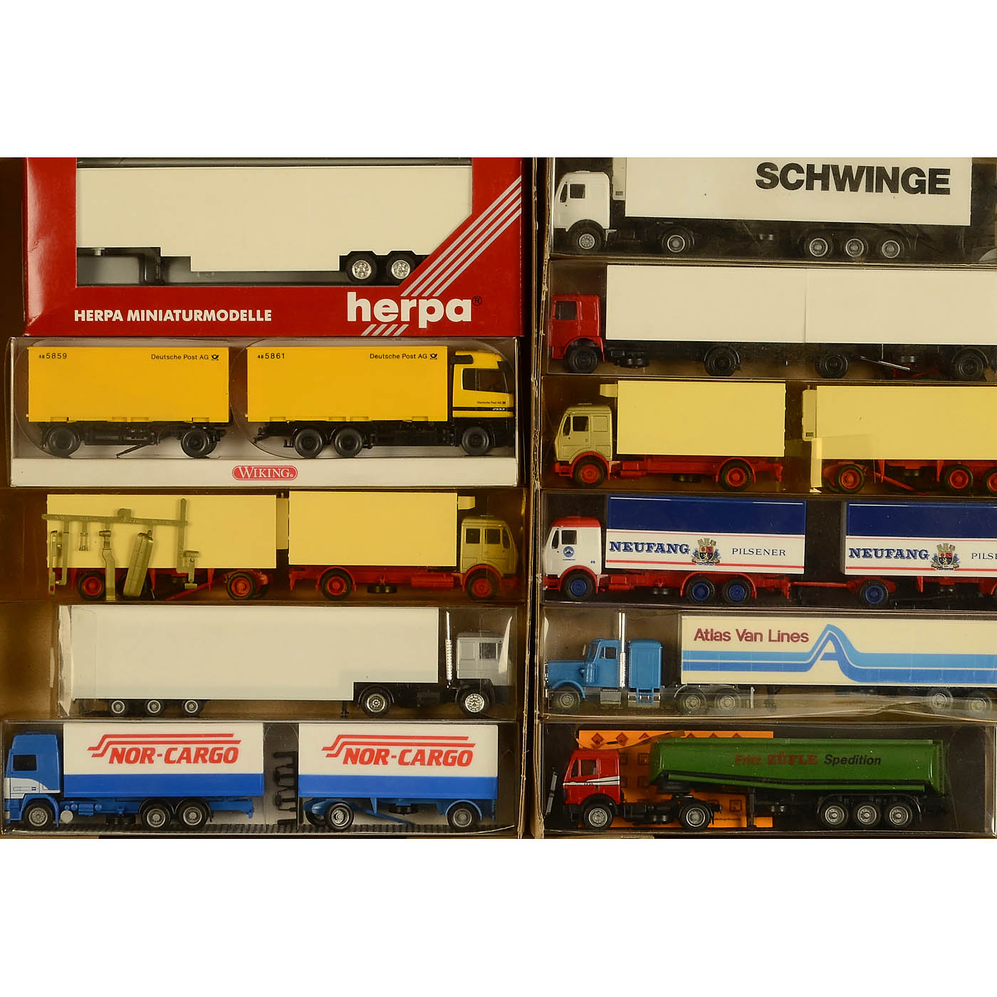 302 plastic models by AMW, Albedo, Herpa, Roskopf and BS Modelle, Igra, Faller, Roco and Wiking, semi-trailers, tank trucks, refrigerated trucks, tractor units and others, in original boxes, vehicles in mint condition, some boxes with minor storage-related wear. - In addition: 50 more vehicles in damaged boxes. - Not all pictured.