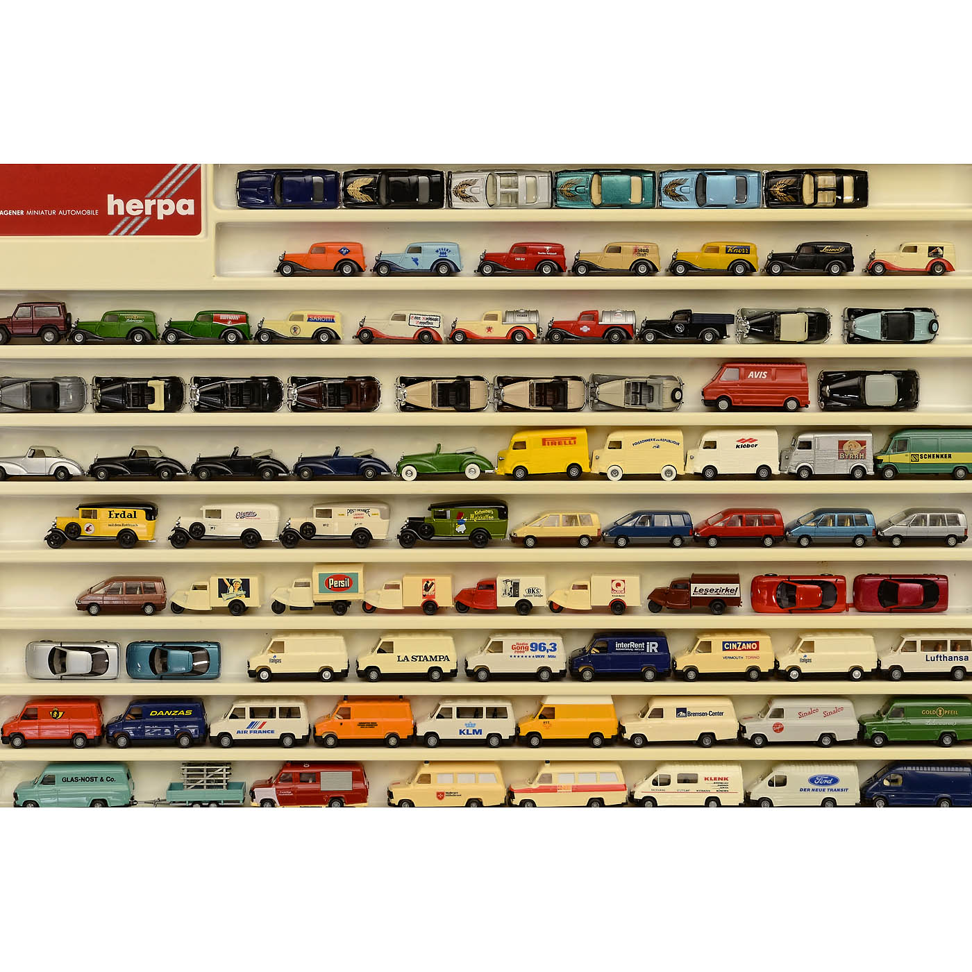1060 plastic models by Wiking, Herpa, Praline, Busch, Eko, Brekina and others, in Herpa display cases, vehicles in mint condition, cases with age-related wear.