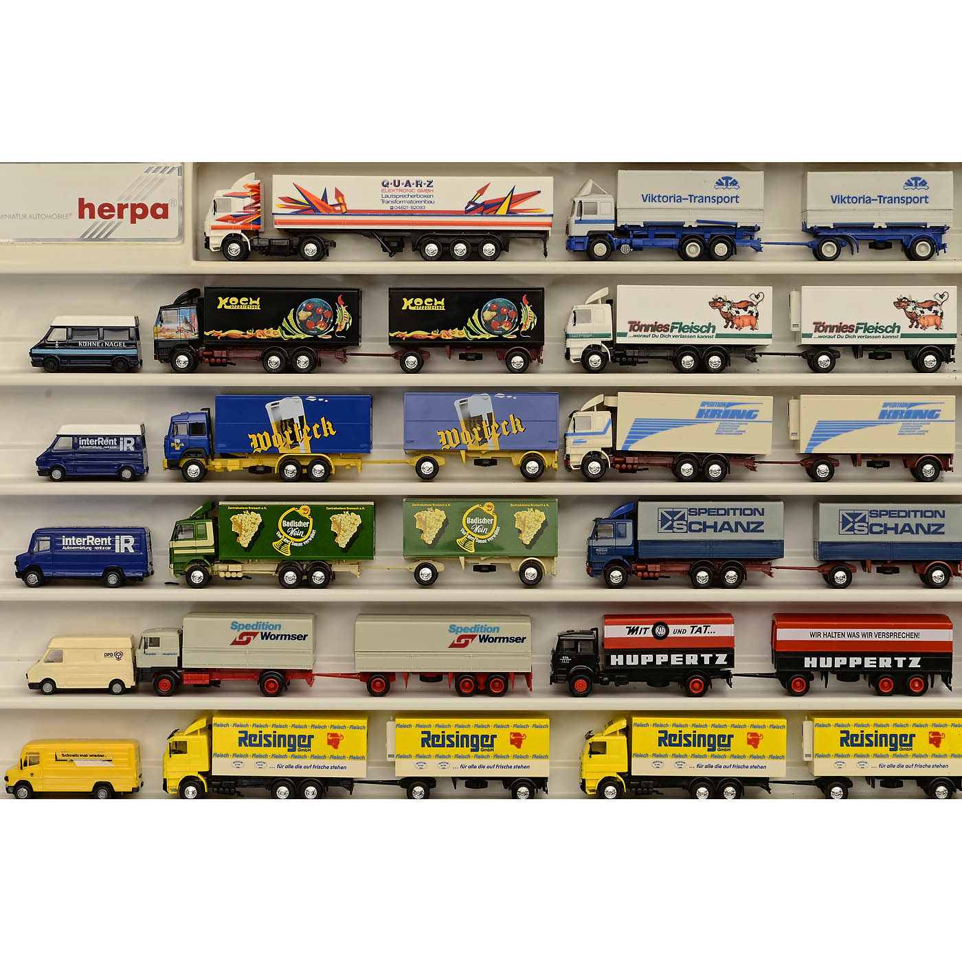 328 plastic models by AMW, Albedo, Herpa, Roco, Wiking and Brekina, in Herpa display cases, semi-trailers, tank trucks, refrigerated trucks, tractor units, transporters, military vehicles and others, vehicles in good condition, cases with age-related wear.