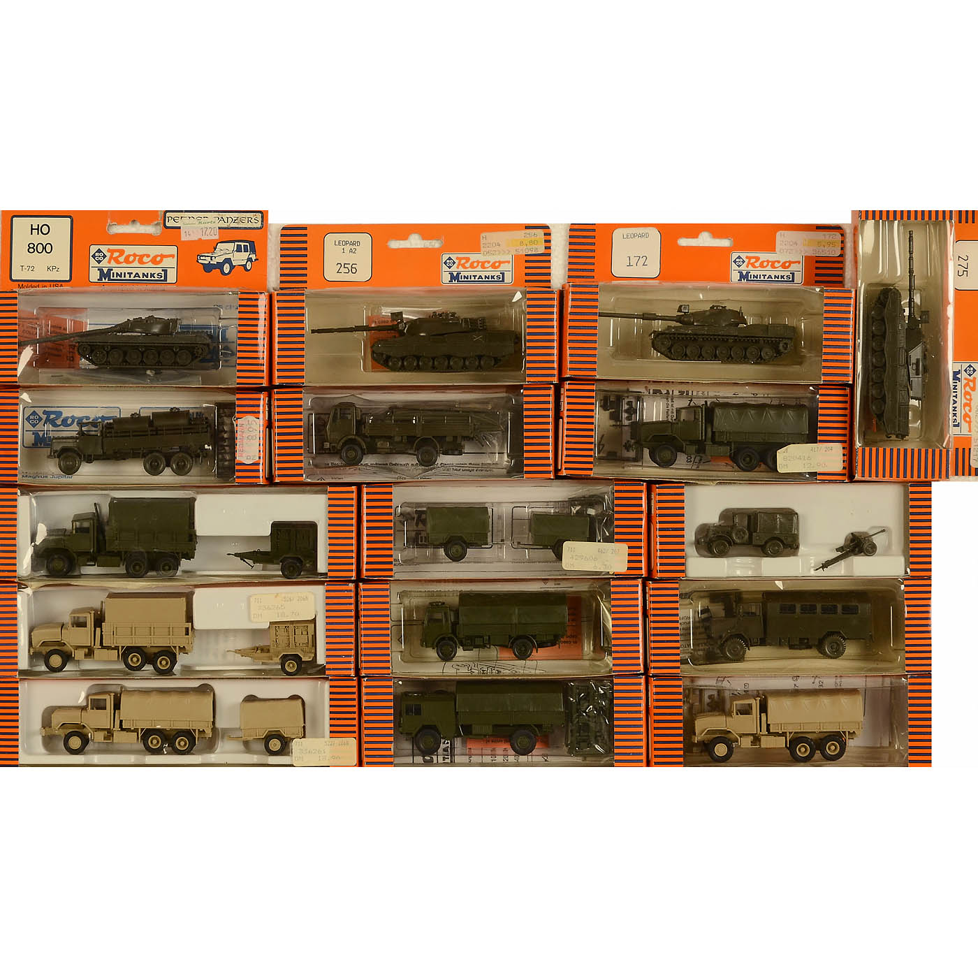 99 vehicles in boxes. 1 x 149 trailer set; 1 x 172 Leopard; 2 x 179 M26 armored transporter; 1 x 190 Faun L908/54; 1 x 256 Leopard 1 A2; 1 x 275 Leopard 1 A4; 1 x 293 MAN N4510/4610; 1 x 296 MAN N4540; 1 x 327 VW Iltis; 7 x 328 2 trailers single-axle; 1 x 329 Leopard 2; 2 x 353 VW Iltis San; 2 x 367 Magirus 168 M 5 T; 4 x 390 Magirus Deutz Jupiter; 6 x 417 M 923 5 T truck; 2 x 431 MAN 630 L; 3 x 436 Magirus FTW; 5 x 444 Willys Jeep set; 3 x 451 Daimler Benz 1017 A; 4 x 454 Magirus 110-16AM; 6 x 460 923 + M200; 5 x 462 trailer set; 4 x 470 Man N 4510; 1 x 480 Dodge Pak; 5 x 482 M151 A2 Set; 1 x 501 Daimler-Benz 1017 A; 3 x 517 M 923 5 T truck; 5 x 518 M923 5 T truck; 7 x 522 M923 + M105; 2 x 524 M1036 TOW; 9 x 526 M923 + M200; 1 x 585 Kommando Fahrzeug M934; 1 x 800 T-72. - In addition: Approx. 50 further vehicles without boxes. - Not all pictured.