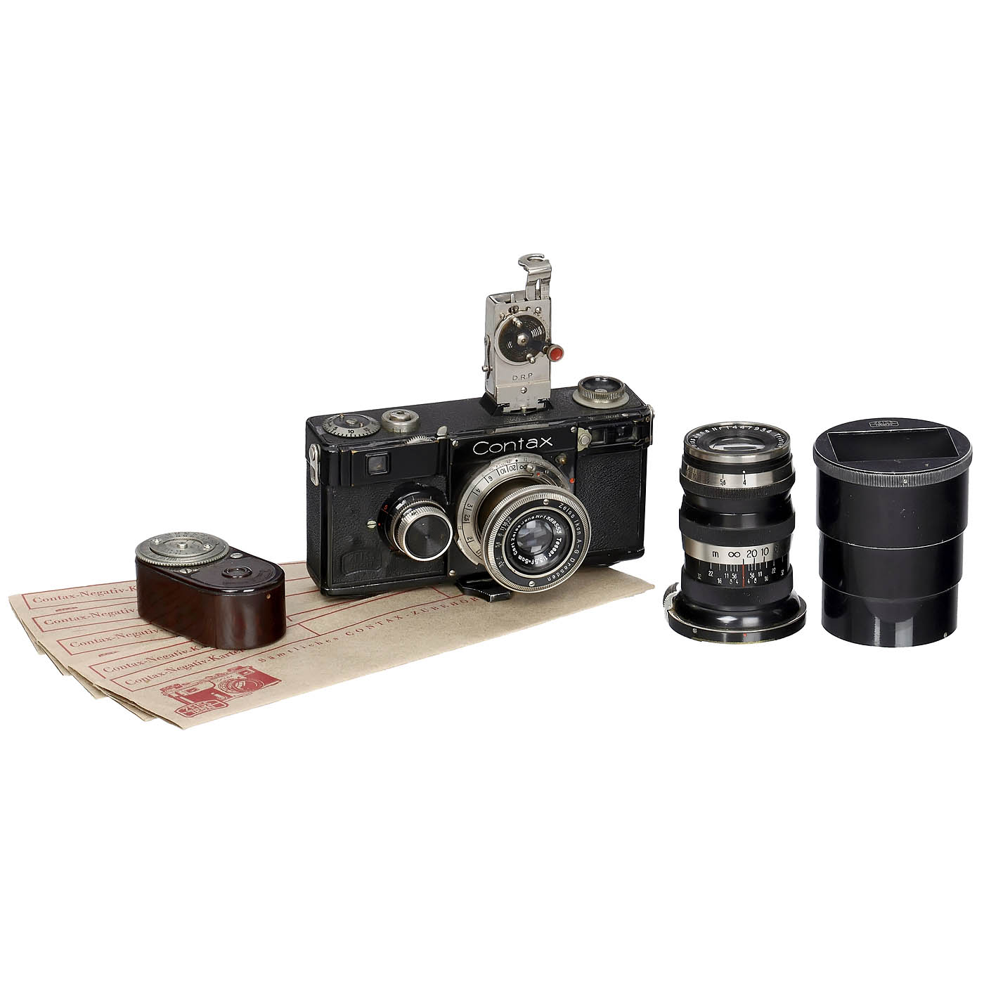 Zeiss Ikon, Dresden. 1) Contax I, sixth version, no. Y 33046, shutter and rangefinder accurate, with nickel-plated Tessar 3.5/5 cm, no. 1389553, and case, optics clean under point light, camera point in very good condition. (2-/2-) - 2) Triotar 4/8.5 cm no. 1447934, nickel-plated, optics clean under point light, with case and maker’s box, near-mint. (2/2) - And: 3) Folding sunshade, Helios light meter (still reacting), Zeiss Ikon self-timer with foot for Contax and 5 unused Contax negative pouches.