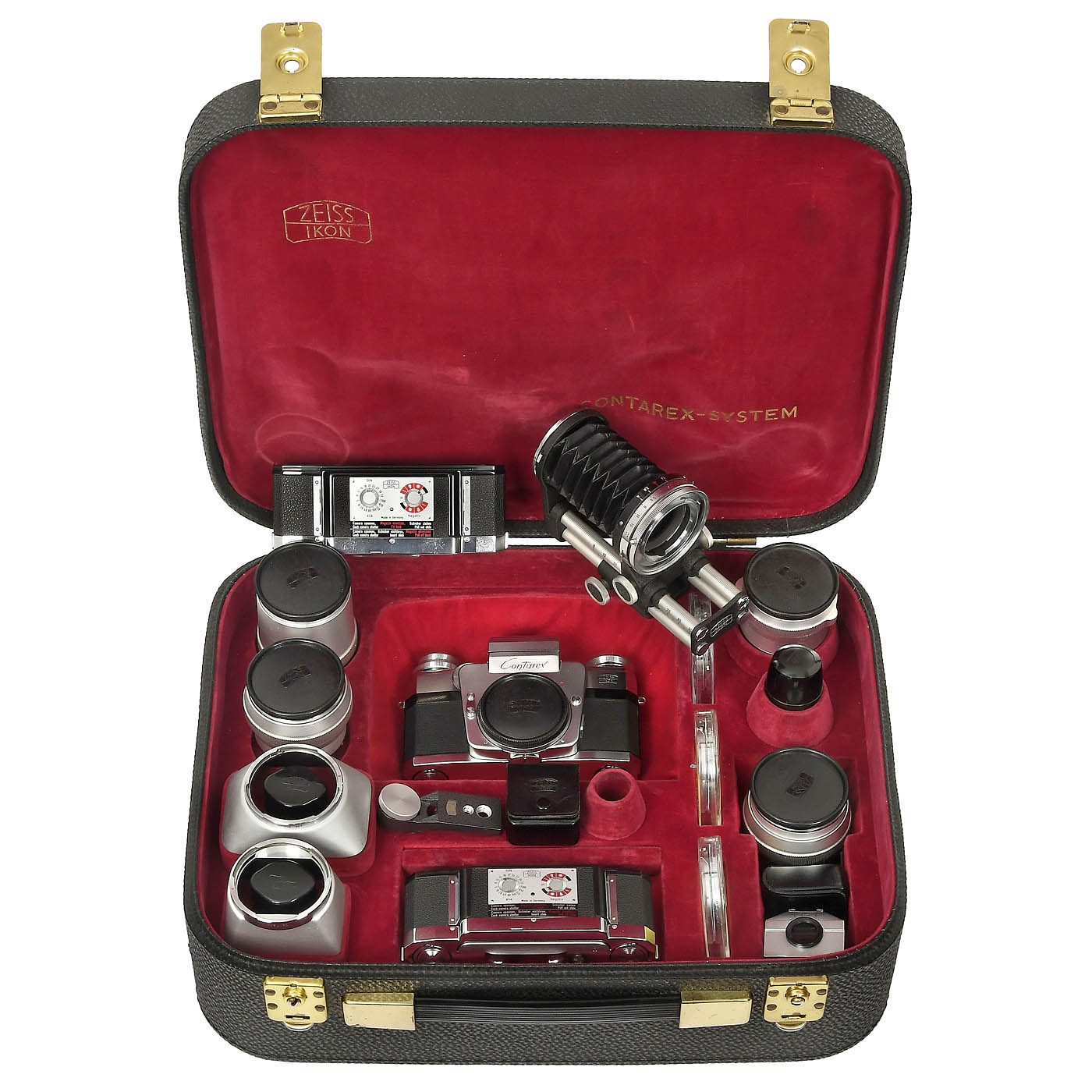Zeiss Ikon, Stuttgart. 1) Contarex Special no. U 24668, with prism and standard viewfinders and case, near-mint. (2/2) - 2) Distagon 4/35 mm no. 3259972, with cap and plexi case, optics clean under point light. (2-/2) - 3) Sonnar 4/135 mm no. 3595981, with cap and plexi retainer, optics clean under point light. (3-/3) - 4) Distagon 2.8/25 mm no. 3563378, with cap and plexi retainer, front element with faint cleaning marks, otherwise very well preserved. (2-/3) - 5) Planar 1.4/55 mm no. 3186828, with cap, cleaning marks across front element visible under point light. (3/3-) - 6) Contarex leather case with both sunshades, 3 cartridges, 2 focusing screens for Special, 3 filters UV, orange and yellow, 2 interchangeable magazines with boxes, bellows device with attachment and double-cable release. (3/3)