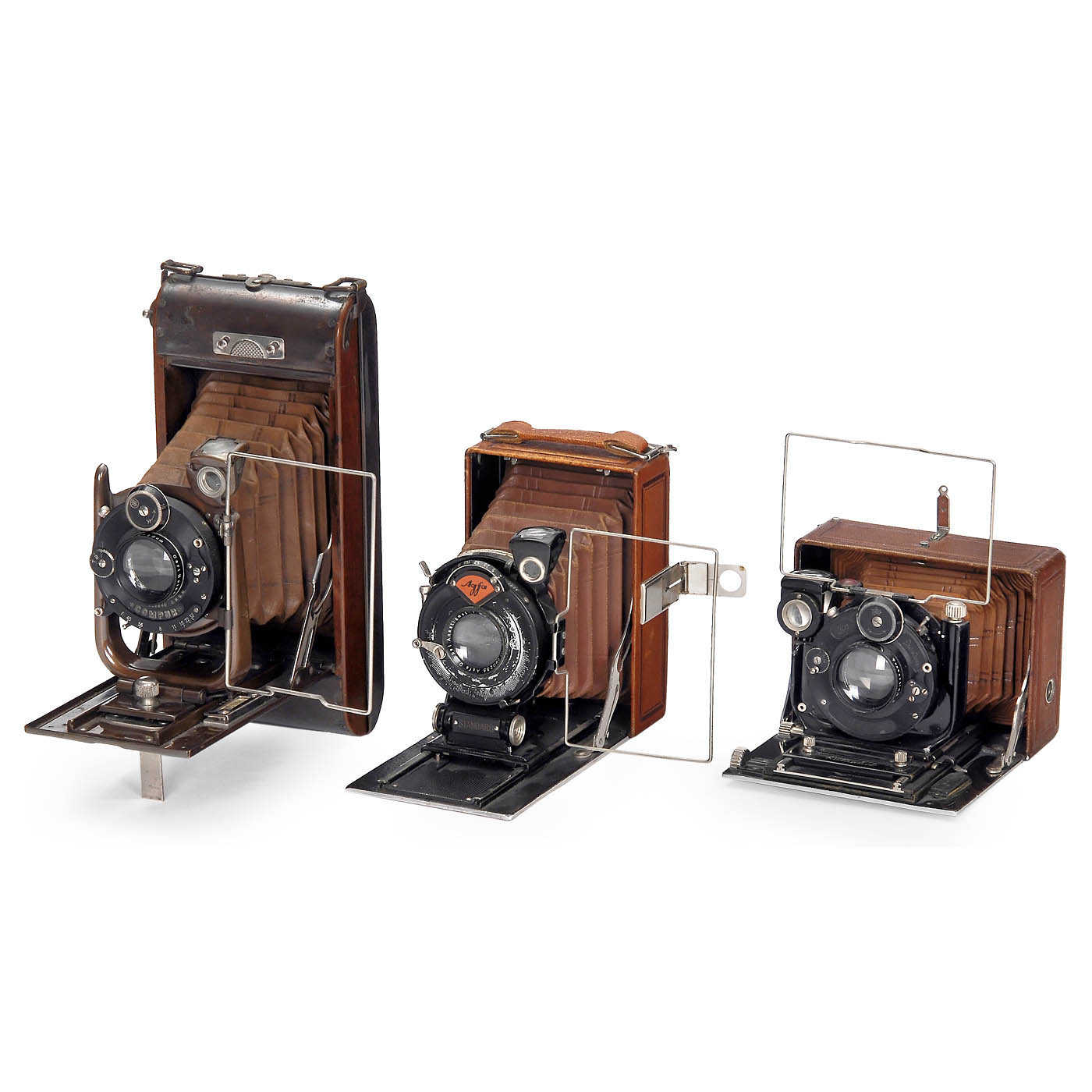 1) Rietzschel, Munich. Clack for 6.5 x 9 cm horizontal format, with brown leather covering, bellows and focusing screen back, Zeiss Tessar 4.5/12 cm lens, Compur shutter, slow speeds stiff, screen cracked. (3/3) - 2) Agfa, Munich. Standard Tropen, for 6.5 x 9 cm vertical format, brown leather covering, bellows and focusing screen back, with Agfa Doppel Anastigmat 4.5/10.5 cm lens, shutter working, focusing stiff. (3+/4) - And: 3) Houghton-Butcher, London. Watch Pocket Carbine Tropical Model, no. D 6924, for 6 x 10.5 cm on rollfilm, tropical wood, brown bellows and Zeiss Tessar 4.5/12 cm lens, Compur working. (3/3)