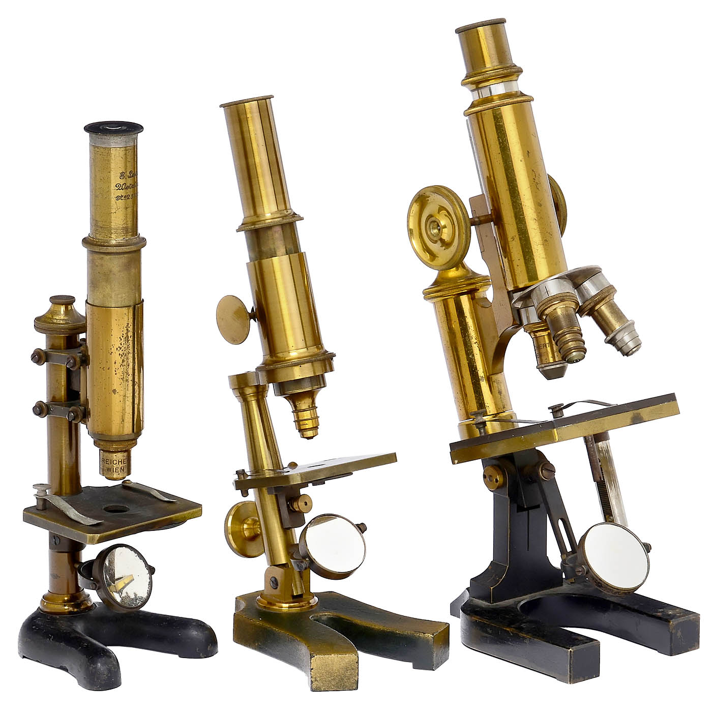 1) E. Leitz, Wetzlar, no. 25137, height 10 1/5 in. - 2) Unmarked, probably Austria, triple revolver, height 11 3/5 in. - And: 3) Unmarked, green-and-gold-painted cast base, fine adjustment by tilting the stage plate, height 11 in.
