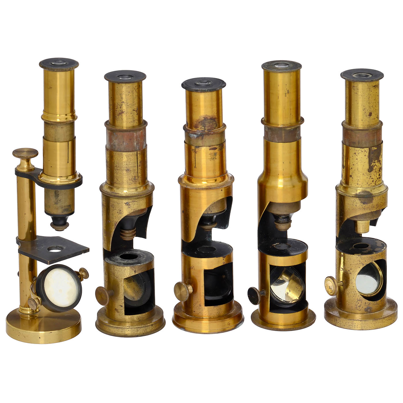 All unmarked, England or Germany, mostly brass, including 4 drum microscopes, with eyepiece and objective, some with further accessories, height up to 9 in., all in the matching cases.