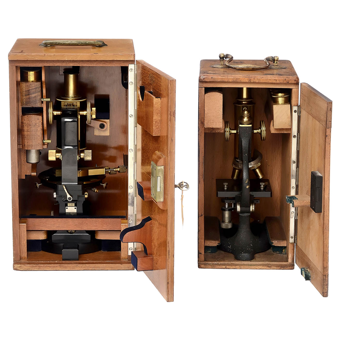 1) Carl Zeiss, Jena, c. 1906, no. 51108, large Zeiss stand No. I, early model with fine adjustment according to Berger, combined rotating and mechanical stage no. 5577, Abbe condenser, swivelling iris diaphragm, double mirror, tube with dovetail for holding the objectives, height 12 ¼ in., with 6 eyepieces, in matching mahogany case with Zeiss key. - Literature: Schmitz, "Handbuch zur Geschichte der Optik", supplementary volume IIA, Bonn 1989, p. 194. - And: 2) F. Koristka, Milan, c. 1920, no. 32289, black-painted horseshoe base, double mirror, height-adjustable condenser with iris diaphragm, triple turret, coarse and fine adjustment, height 11 3/5 in., with 3 eyepieces and 3 objectives, in matching case.