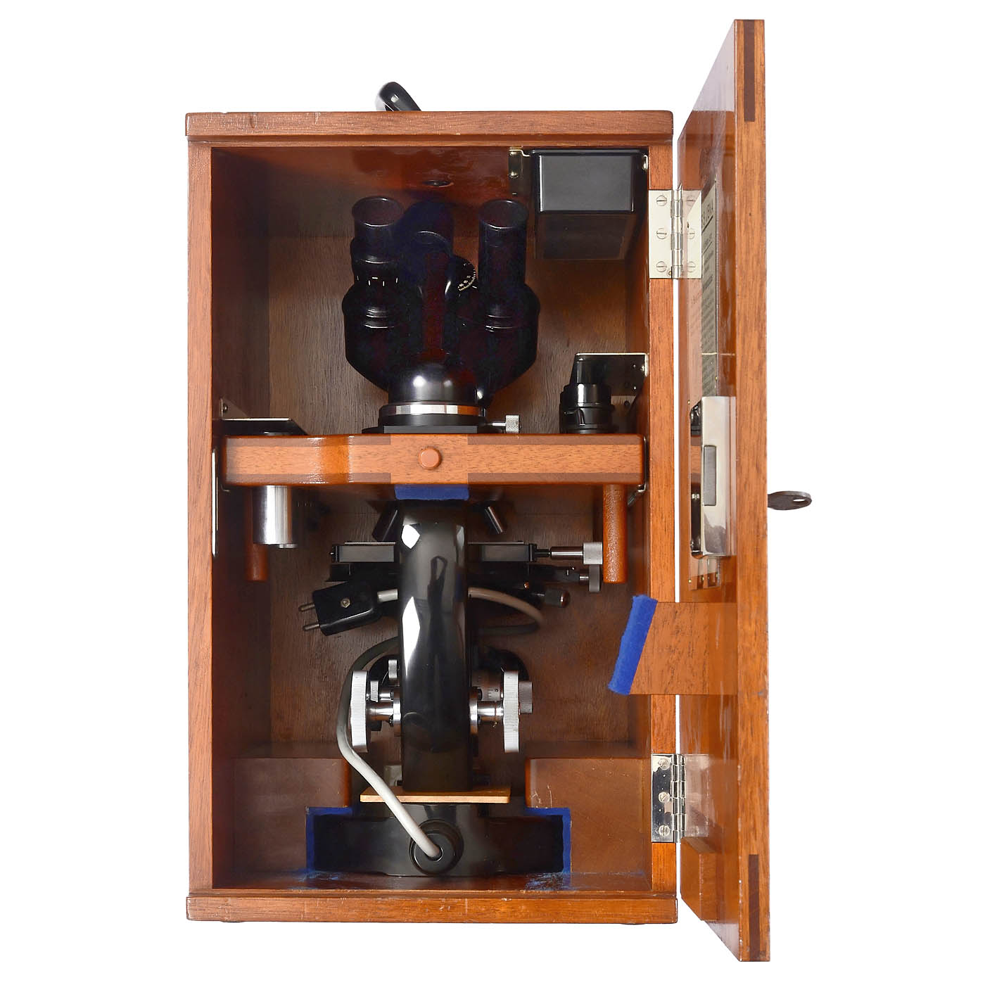 Jena, no. 290957, for work in incident and transmitted light, interchangeable tube carrier head with monocular and binocular inclined tubes, interchangeable 4-part slide revolver, xy movable, adjustable and rotatable cross-stage, Abbe illuminator, triple condenser revolver, low-lying fine and coarse adjustment, with 8 eyepieces and 6 objectives in matching wood case, fine adjustment slightly resinous, otherwise mint condition, height 15 3/4 in. - In addition: 2 boxes with further accessories, eyepieces, illumination unit, projectives and photo attachments.
