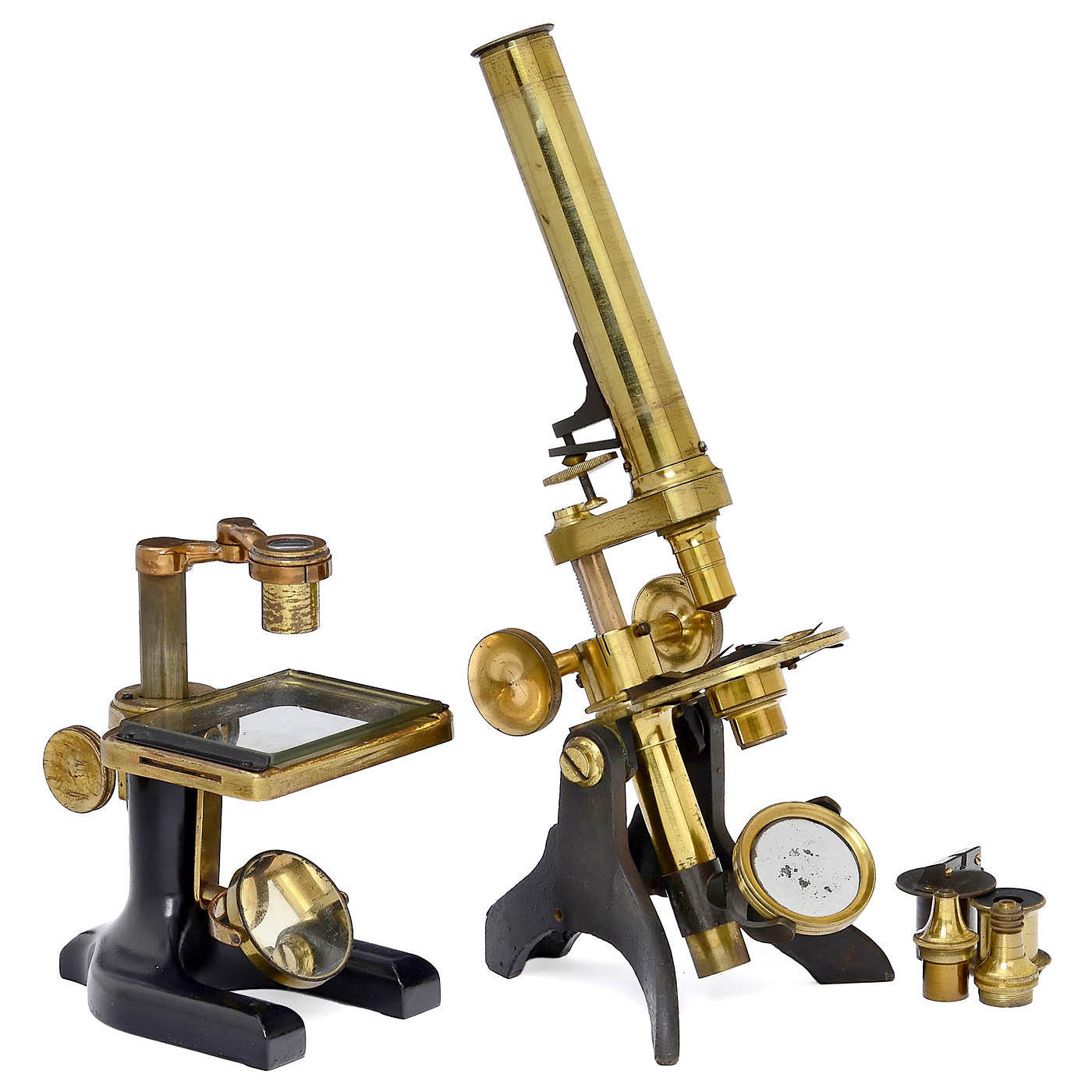1) Unmarked, England, c. 1895, black-painted claw base, tilting stand, original lacquered brass, concave mirror, sleeve with prism under the stage, 2 clamps on the stage, coarse adjustment with 2 knurled screws, fine adjustment to the objective, tube screwed into the arm, 1 eyepiece, 2 objectives, in matching mahogany case, drawer for microscope slides, height 12 ¼ in. - 2) Dissecting microscope, c. 1910, Spencer, Buffalo, New York, brass and cast iron, double mirror, arm for the lens with single joint, rack-and-pinion adjustment, 1 objective (x 6). - 3) E. Hartnack & Cie, Place Dauphine 21, Paris, c. 1875, lacquered brass, cast-iron foot, concave mirror, substage pinhole disc, sliding tube, fine adjustment with knurled screw, height 11 ¾ in., 1 eyepiece, 1 objective. - And: 4) Emil Busch, Rathenow, c. 1900, no. 9924, black-painted cast-iron foot, original lacquered brass tube, double mirror, substage pinhole disc, sliding tube, 1 eyepiece, 1 objective, height 11 in., in matching oak case.