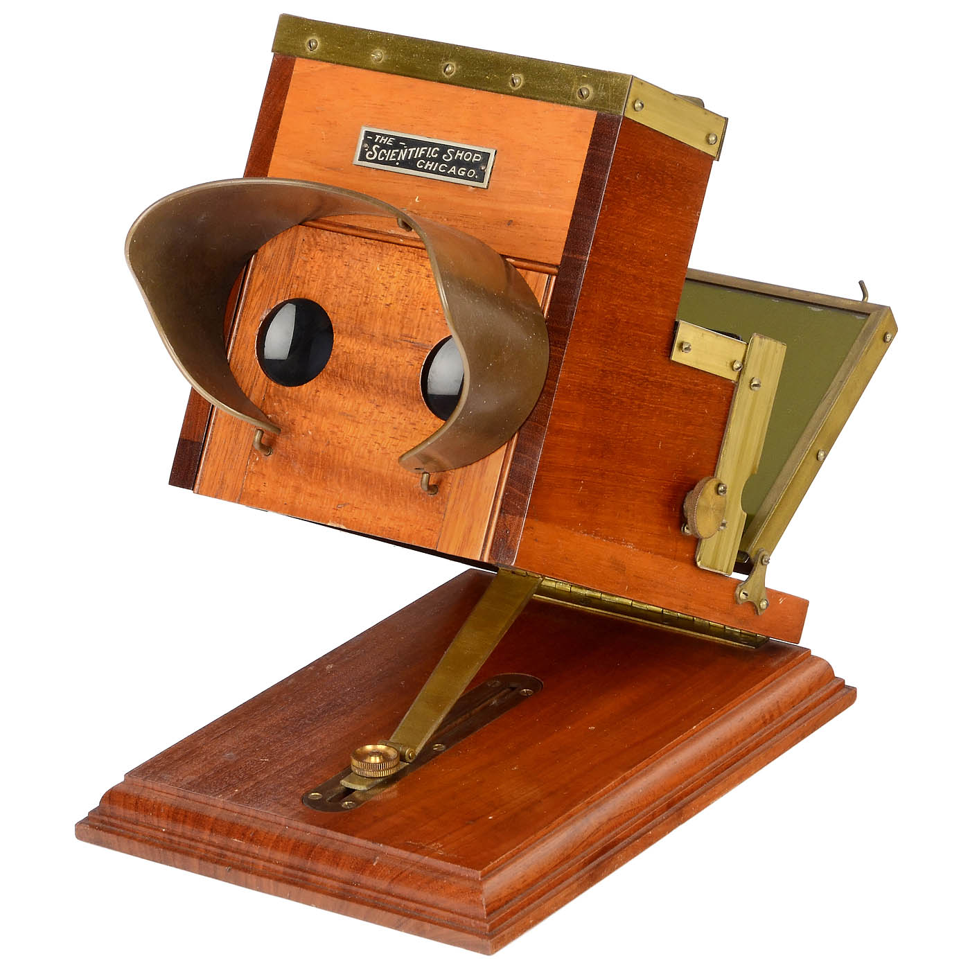 The Photochromoscope Syndicate Ltd., London. No. 344, export model for the USA, with retailer's plate "The Scientific Shop, Chicago", complete filter set, mahogany body with brass fittings, in fitted wood case, excellent condition. - Literature: Wing, "Stereoscopes", pp. 218-220.