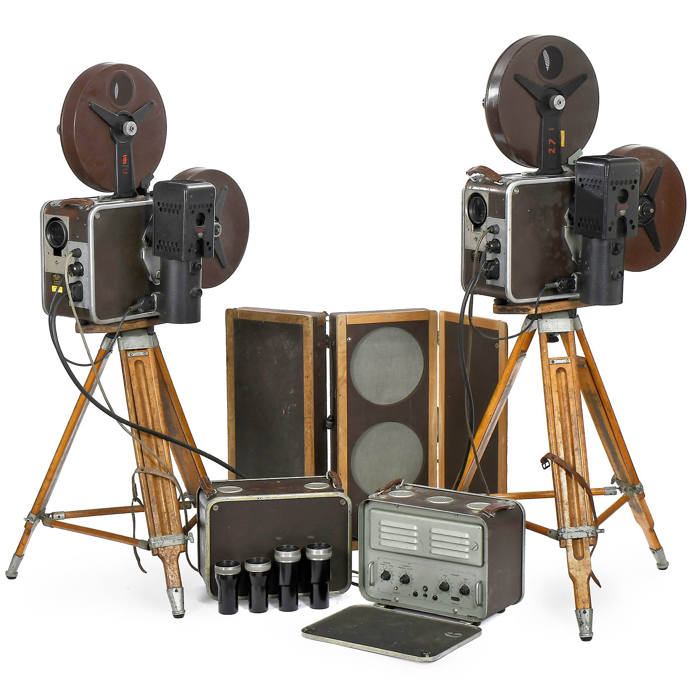 Carl Zeiss Jena, VEB, Jena. The "Tonfilm-Koffer-Anlage 35" (Sound Film Suitcase 35) consists of two film projectors with fire-protection drums for 600-meter long films with the associated empty reels. The large lamp houses can be sealed off for transport. The two projectors stand on folding wood tripods. In addition to the two Kipronar 14 cm projection lenses in the projectors, there are two replacement Kipronar lenses with a focal length of 14 cm and two more with a focal length of 12 cm. The equipment also includes a switchable power supply and a light amplifier. Another case contains two speakers. All connection cables are present. The accessories case contains two winding stands for rewinding, replacement cables and empty spools. An operational traveling cinema, electrical functions are untested. - Note: In 1947, the Soviet military administration gave the newly expropriated Carl Zeiss Jena company the order to begin mass production of this portable suitcase cinema based on Soviet designs. Film was an important vehicle for propaganda and entertainment. "TK 35” systems were used by the Soviet armed forces, the National People’s Army, in youth association holiday camps and by mobile rural film organizations. Because of the low price, many of the sound film cases were also sold to West Germany. The "TK 35" projectors, which had been improved several times in terms of design, were in operation in the GDR and the Eastern Bloc states until their collapse in 1990.