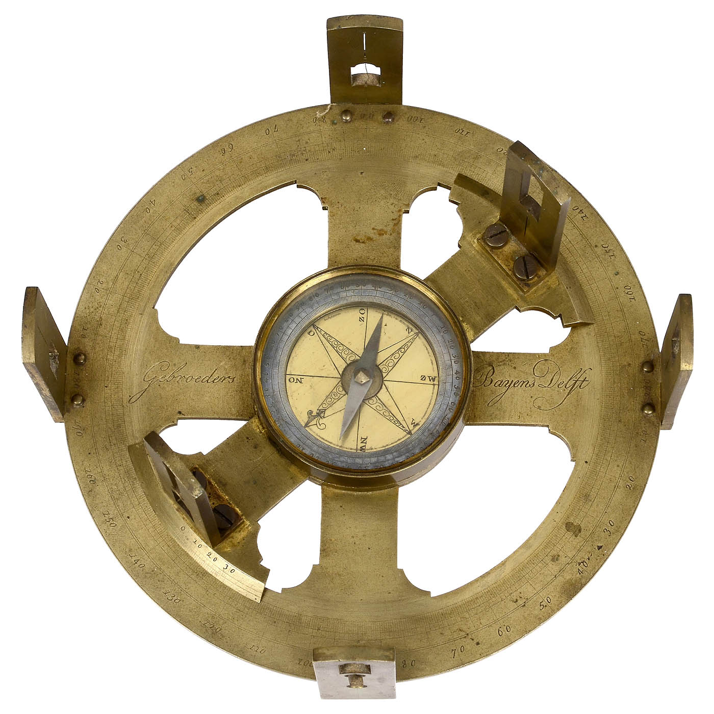 1) Full-circle instrument (circumferentor), c. 1850, signed on the silver-plated compass "Will'm Wilton, St. Day, Cornwall", with 2 sights and lid, Ø 5 in. - And: 2) Dutch circumferentor, signed "Gebroeder Bayens, Delft", c. 1820, compass with silver-plated scale, with 4 sights, Ø 7 ¼ in.