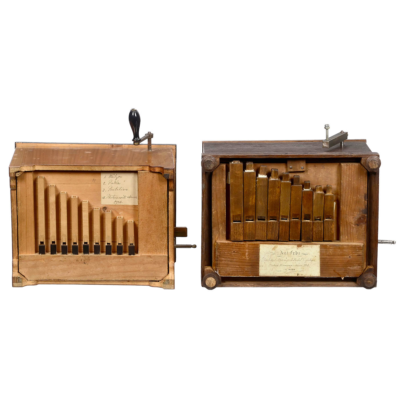 1) Ant Erbs, Vienna, playing eight airs, with hand-turned mechanism, 9 notes, labial pipes, replacement oak case, crank and pipes, old mechanism, crank and maker's label on the underside, case width 9 ½ in., working. - And: 2) Unmarked, no. 2736 on the barrel, playing four airs, with hand-turned mechanism, 9 notes, labial pipes, spruce case with cherry veneer, handwritten tune-sheet on the underside, case width 9 in., working.