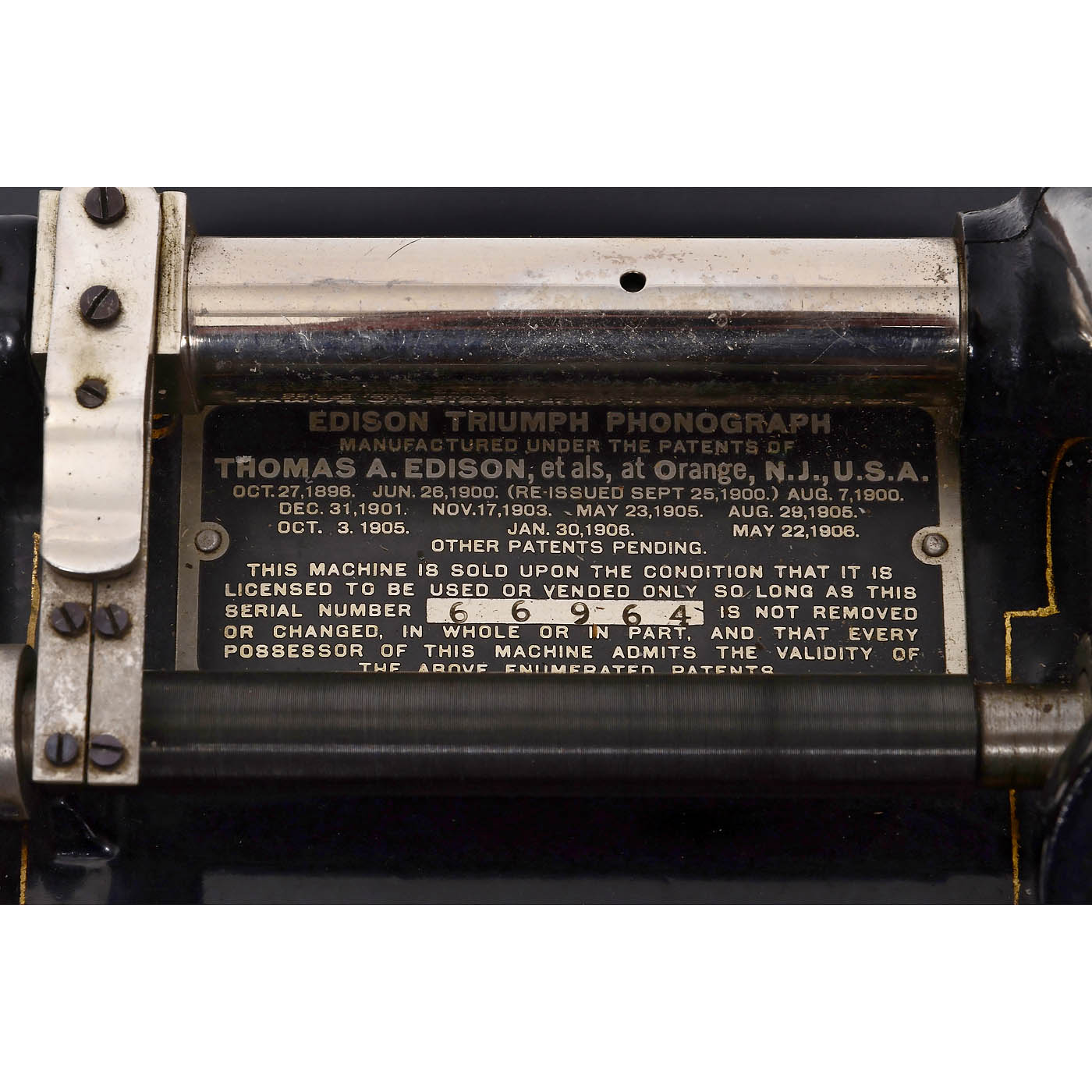 No. 66964, for two-minute cylinders, with triple-spring motor, Model C reproducer, shaver, bedplate with original finish, gilt decoration and "Thomas A. Edison" lettering, oak case with lid, original crane and twelve-panel Triumph horn with original finish, length 34 3/4 in., working, with 3 cylinders.