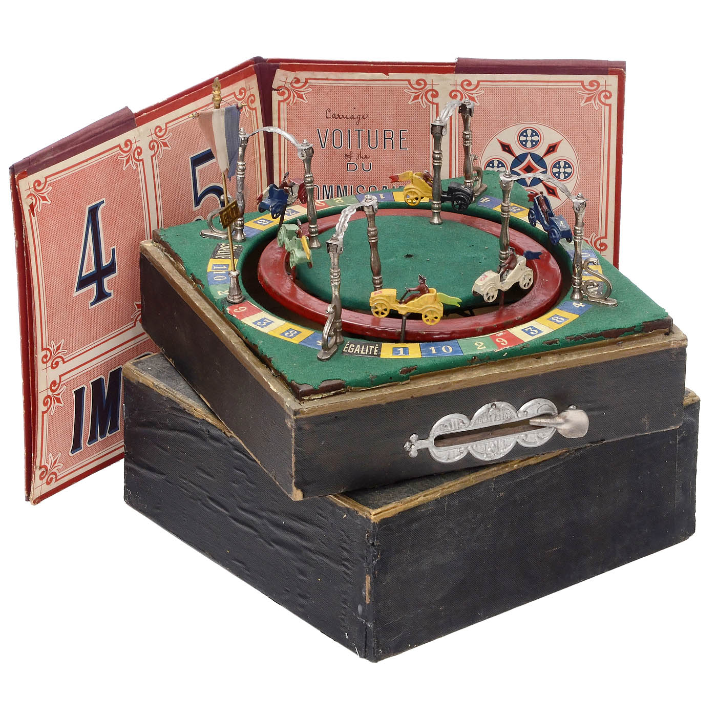 French mechanical toy, with 6 racing cars in 2 circles, lever-powered, cast metal superstructures and cars, one driver's head missing, large folding card game board, overall size 29 x 19 in., working condition.