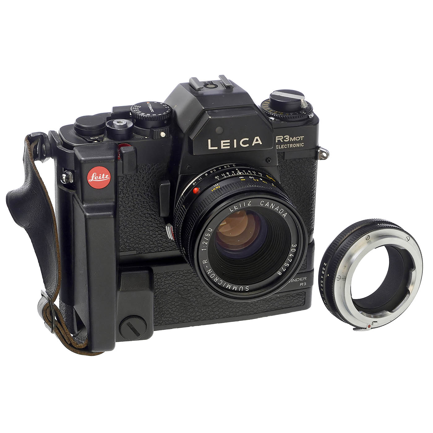 Leitz, Wetzlar/Canada. 1) Summicron-R 2/35 mm, c. 1979, no. 2996947, minor film on front edge when viewed under point light, irrelevant for use. (3-/3) - 2) Leicaflex no. 1119077, the first SLR by Leitz, c. 1965, with "bean-shaped" image counter, Summicron-R 2/50 mm no. 2273872, retaining ring 14160 and lens hood 12564, optics clean under point light. (3/3) - 3) Summicron-R 2/50 mm, c. 1980, no. 3047578, marked "FOR LEICA R ONLY ", optics clean under point light. (3+/3+) - 4) Lens adapter 14127 F for Visoflex M on Leica R. (3/3) - And: 5-6) Leicaflex SL no. 1215780, dents on the housing, shutter works, and Leica R3 MOT no. 1496873 with Winder R3, electrics untested. (4/-)
