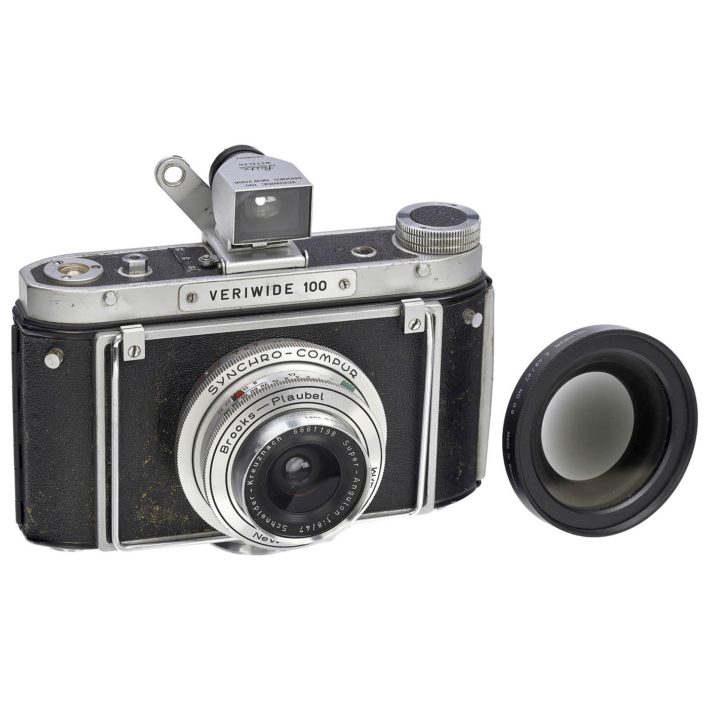 Brooks and Plaubel. No. 60/981, super-wide-angle camera for 6 x 9 exposures on 120-rollfilm, with Schneider Super-Angulon 8/47 mm lens, Heliopan center filter for vignetting-free shots (ND 0.9 requires 3 additional stops), Leitz mirror viewfinder for "Veriwide 100, Brooks, New York" and the original functional quick-attach Rolleiflex camera strap, optics appear clean, shutter sticking.