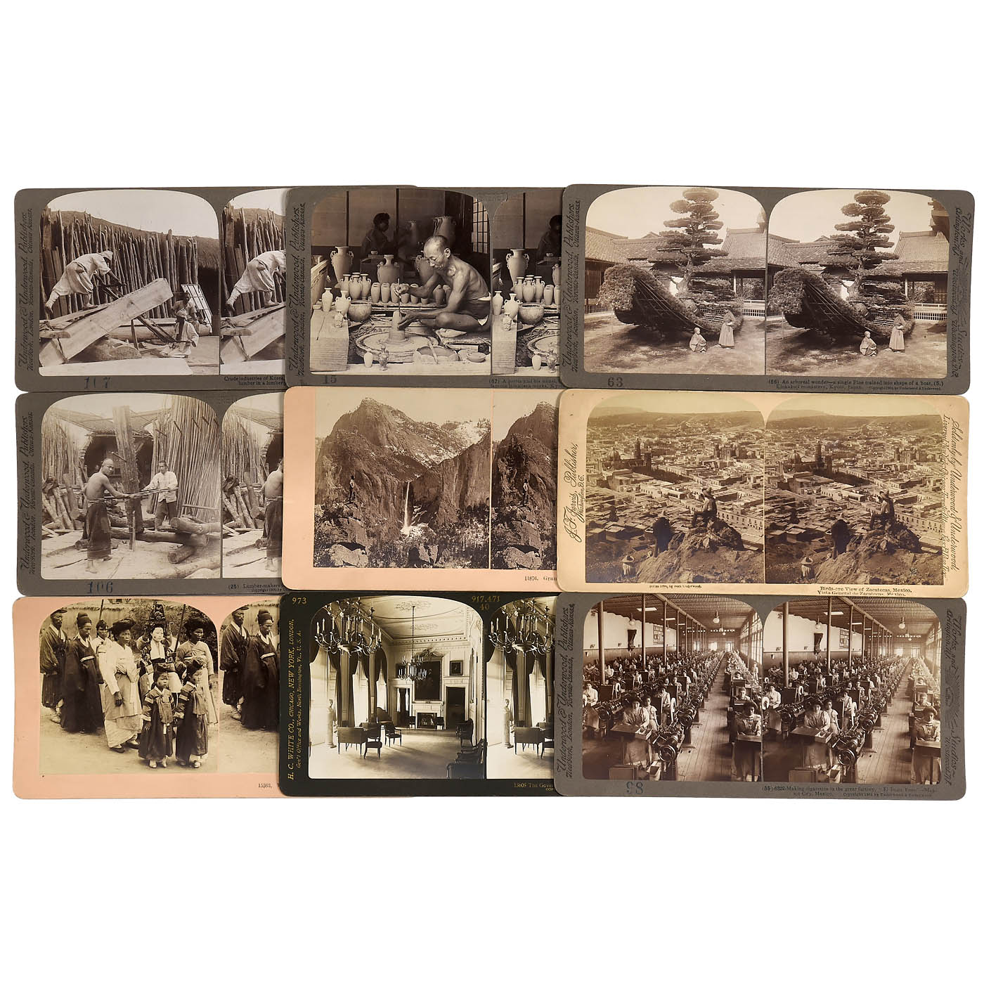 American stereo cards by Griffith, Jarvis, Keystone, Kilburn, Strohmeyer, Underwood and White, good to very good condition. 1-3) School Room Travel Vol. I, II and III, small boxes for approx. 50 cards each: Vol. I with 5 stereo exercise cards, 22 "Third-Dimension Eye-Training Series" cards and 12 of animals, including elephants; Vol. II with 44 cards of England, Ireland and Canada and Vol. III with 47 cards America, Yosemite Valley, Mexico, Cuba, Australia and New Zealand. - 4-5) School Room Travel Vol. I and III, large boxes for approx. 100 cards each: Vol. I with 88 cards of Europe and Vol. III with 92 cards of America. - 6) Underwood book-form box "Scotland through the Stereoscope" Vol. I, II, III, but containing 75 stereo cards from Asia only, including 31 of Japan, 10 of Ceylon, 16 of India, 8 of China and 2 of Korea. - And: 7) 46 cards, including 20 of Italy, 13 of Egypt and 11 of Greece.