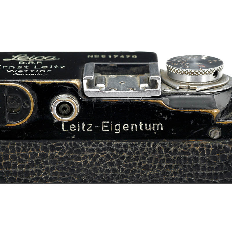 Leitz, Wetzlar. 非常罕见的黑色 Leica IIIc, 供Leica 内部使用. 背面有刻记"Leitz-Eigentum(莱兹所有)". 相机的序列号真实(参见Lager, Leica Volume I, S. 64/65), 带镀铬Elmar 3.5/5cm 镜头. 莱卡历史上极罕见的一台相机.