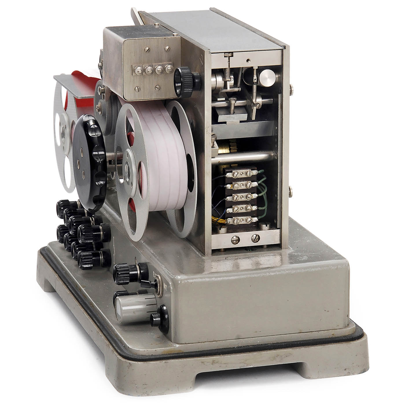 FAVAG/Neuchâtel. 1) Control unit for a time interval, with time clock and plug-in contacts with French lettering, 110/220 volts, suitable e.g. for a tachistoscope. - And: 2) Tape chronograph, similar construction to a Morse receiver, spring-drive, with 4 needles instead of pins to produce a series of fine punctures on the paper tape, for reproduction in graphic form the time record of a chronometer and the ocular micrometer of an astronomical theodolite, with lid.