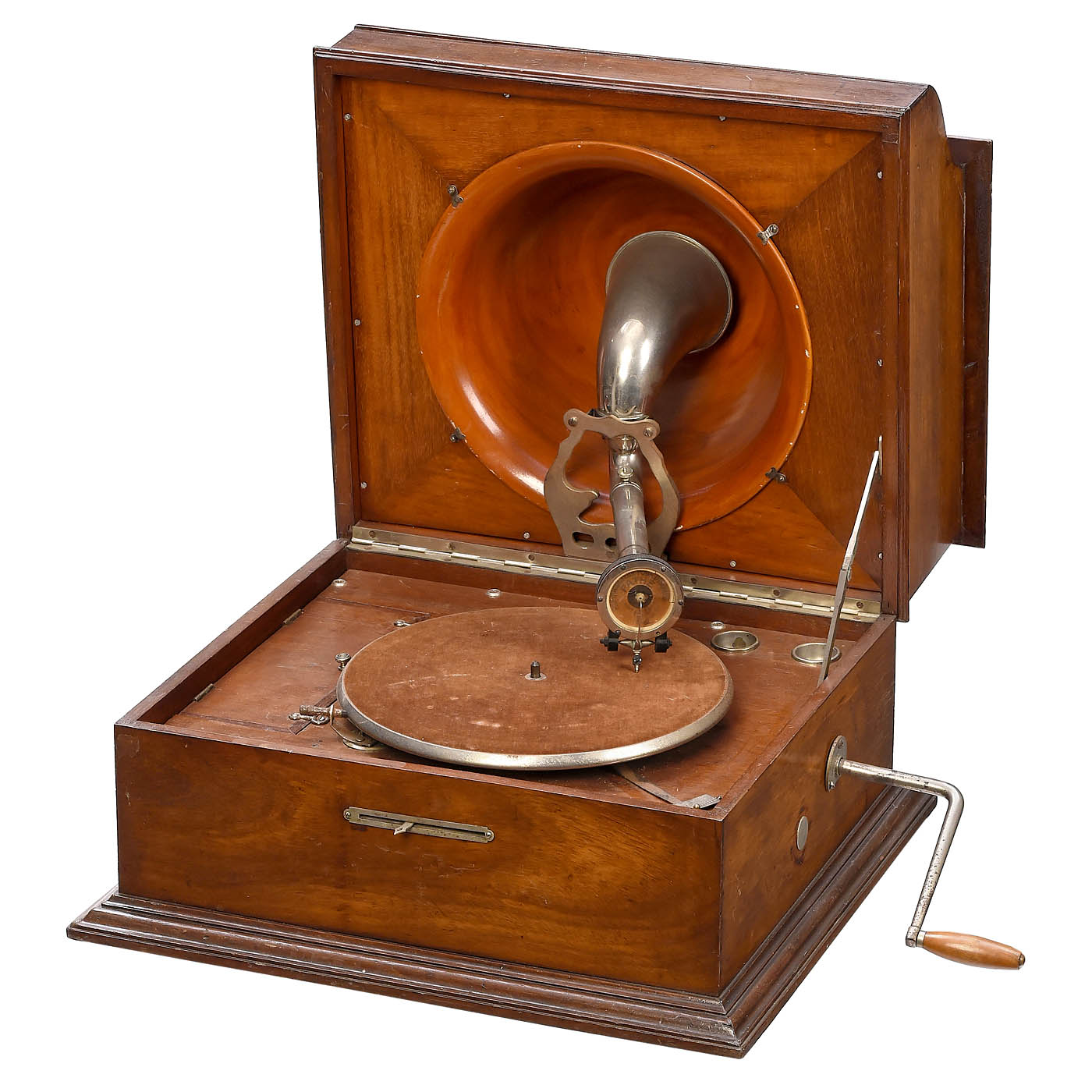 Pathé, Paris. For vertically-cut records, reflex horn in lid, Pathé reproducer, walnut case, left side with compartment for pick-up arm and crank, working.