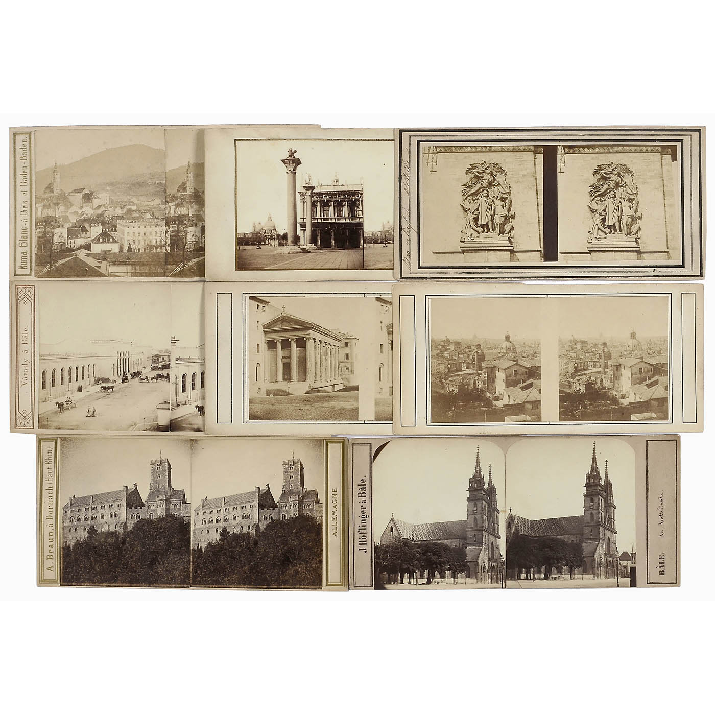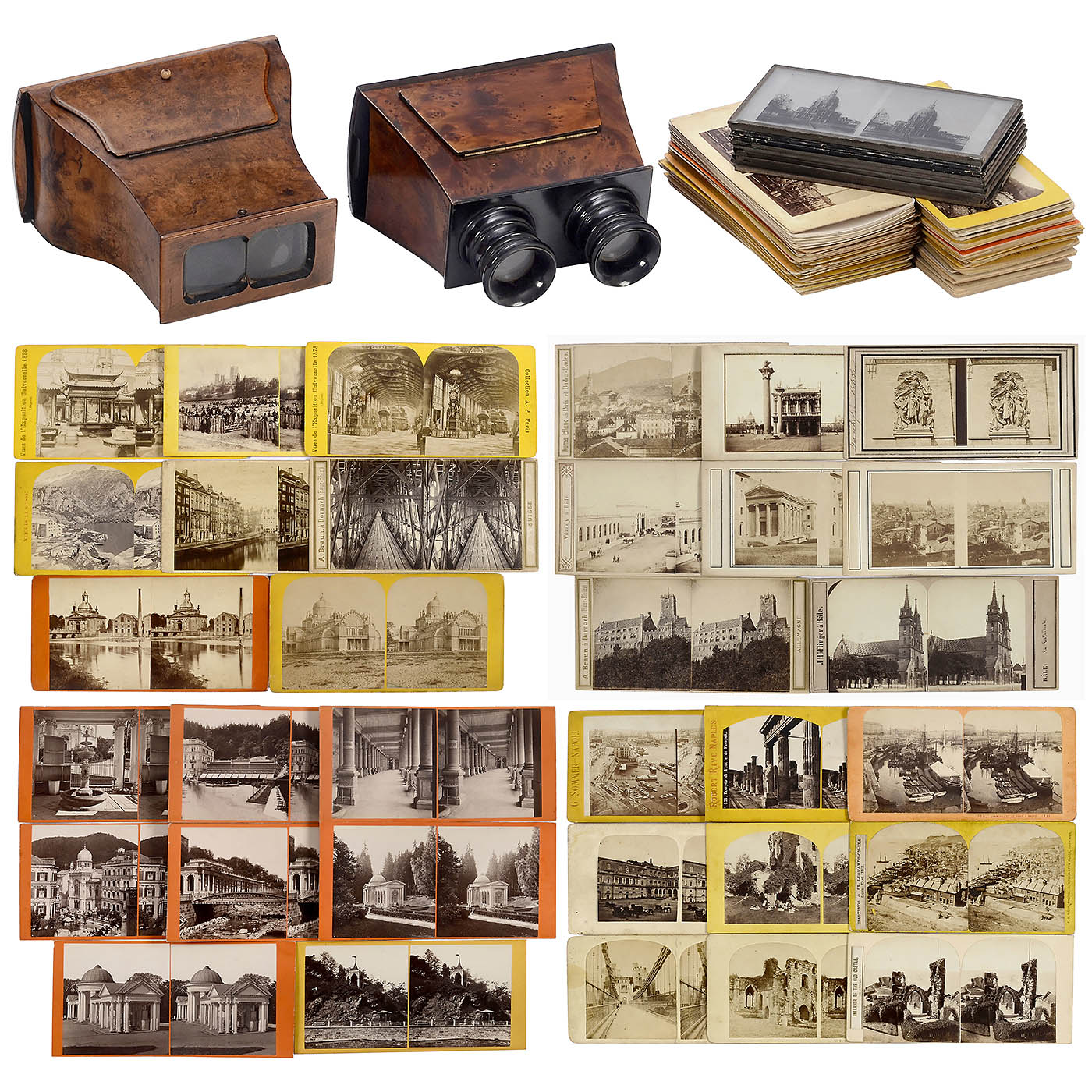 1–2) Early stereo viewers with burl wood veneer for 9 x 18 cm stereo slides or stereo cards in the versions with normal eyepieces or prism eyepieces. (3/3) – 2) 10 early collodion slides 9 x 18 cm. – 3) Early stereo cards 9 x 18 cm, in varying condition, but without stains: 8 x cards on the development history of the stereo card front page layout, 4 x Amsterdam, 13 x Switzerland, 30 x Italy, 18 x Germany/Austria, 16 x Karlsbad/Marienbad in mint condition, 11 x Photograph Hautecoeur Paris, 17 x Paris/France, 9 x England (2 x with names: Mann and Slingsby) and 7 x World's Fair 1878 and 1867. – And: 4) Stereo cards after 1900: 21 NPG Berlin glossy cards. (3+/–)