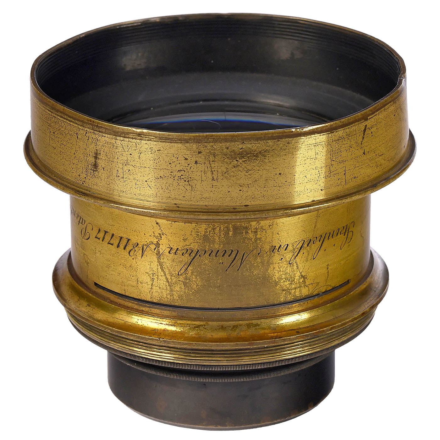 Steinheil, Munich. Very early no. 11717, focal length 3.2/24 cm (comparison measurement with Fliegertruppen-Tessar 4.5/25 cm) as the front Ø of the glass is only 75 mm (with sunshade 10 cm), minor scratches on the rear and front lenses in the center which do not affect practical use with the aperture open, otherwise the glass is clean under point light, with matching screw ring of the period (not original, thread was re-tightened), height 9 cm, all lens parts screw-mounted and removable, set up for very thin Waterhouse-stop of 75 mm width. Unscrewing the last separate lens element in the rear of the camera 2 ½ times (or 900°) enables the reduction of remaining weak zone errors for a clean image field of 18 cm Ø with a constant 5mm curvature of field. – Impressive, high-speed and tightly built lens designed to avoid vignetting, a great rarity.