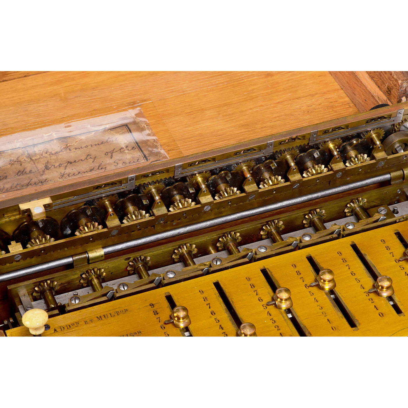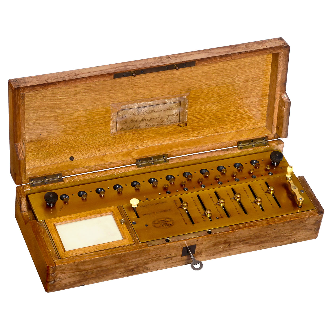 1st calculator in the world produced in series. Invented 1820 by Charles Xavier Thomas, Colmar/Alsace, later Paris. Marked: "Thomas de Colmar, Inventeur, 44 Rue de Chateaudun, Paris", with 6 input sliders, 7-digit revolution counter and 12-digit results mechanism. Serial no. 1915, brass mechanism in oak case, with lock and key, excellent working condition.