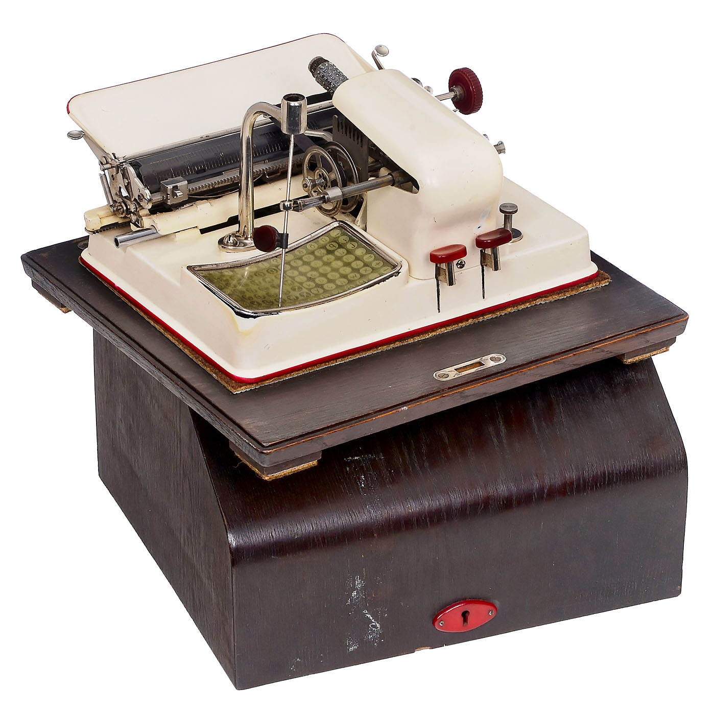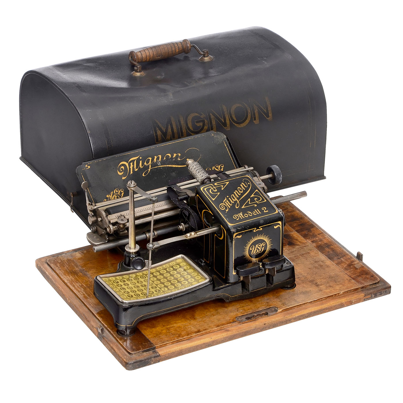 1) Mignon model 2, 1905 onwards, serial no. 24828, German index typewriter, interchangeable type-sleeve, downstroke, made by AEG-Union Schreibmaschinen GmbH, Berlin, with original tin cover. ÿ Literature: Martin, 1949, p. 200. ÿ And: 2) Colored Mignon-4, 1923 onwards, beige, original paint, serial no. 315685, with wood cover.