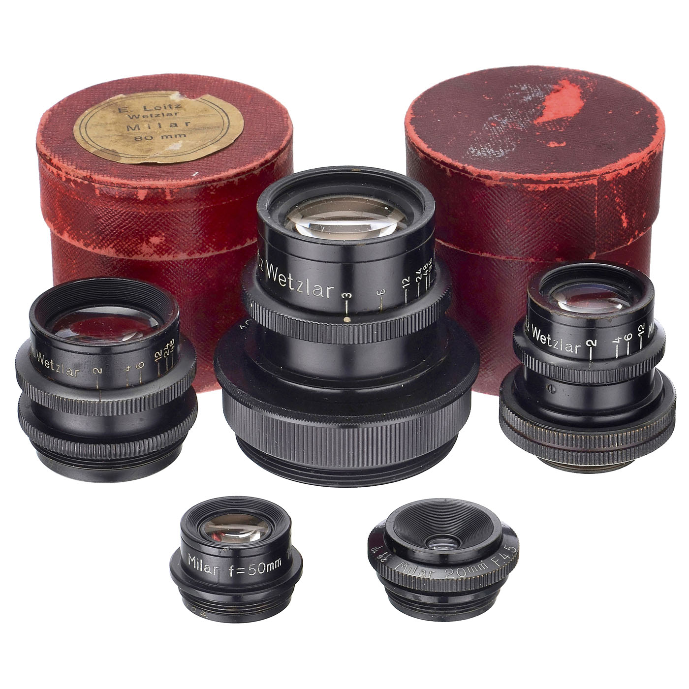 Leitz, Wetzlar. All lenses good to clean under point light. 1) Milar 4.5/20 mm, iris diaphragm, note engraved on the rear lens "19.95 mm". ÿ 2) Milar 4.5/6.5 cm, iris diaphragm, note engraved on the rear lens "35749", with adapter for microscope screw mount. ÿ 3) Milar 4.5/8 cm, iris diaphragm, note engraved on the rear lens "20408", with red box. ÿ 4) Milar 4.8/10 cm, iris diaphragm, note engraved on rear lens "37175", with adapter ring M39 and red box. ÿ And: 5) Milar 4.5/50 mm, note engraved on rear lens "37704".