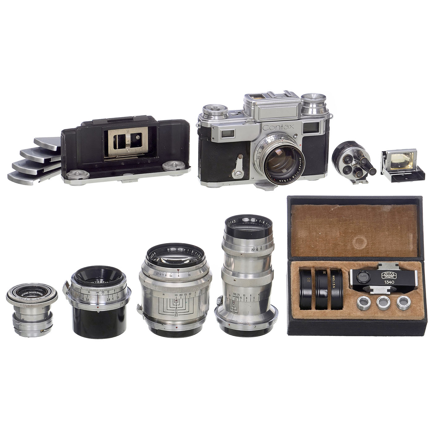 Zeiss Ikon, Dresden, all lenses (except the 1.5/5 cm) in good to clean condition under point light and with front and rear caps. Contax III no. G 14286, light meter not working, Biogon 2.8/3.5 cm T with large rear cap, Tessar 3.5/5 cm T, Sonnar 2/8.5 cm T with lens hood and filter, Sonnar 4/13.5 cm T, Jena universal viewfinder type 463/7 (heavily used), bright-line viewfinder type 433/25, plate adapter with focusing screen and 5 cassettes, Contameter with 3 close-up lenses in a case, 35mm film cassettes in bakelite containers, lens hood, filters, and original cable release, all in a Zeiss Ikon case type 1777/43 with key. ÿ In addition: Sonnar 1.5/5 cm T, with internal coating.