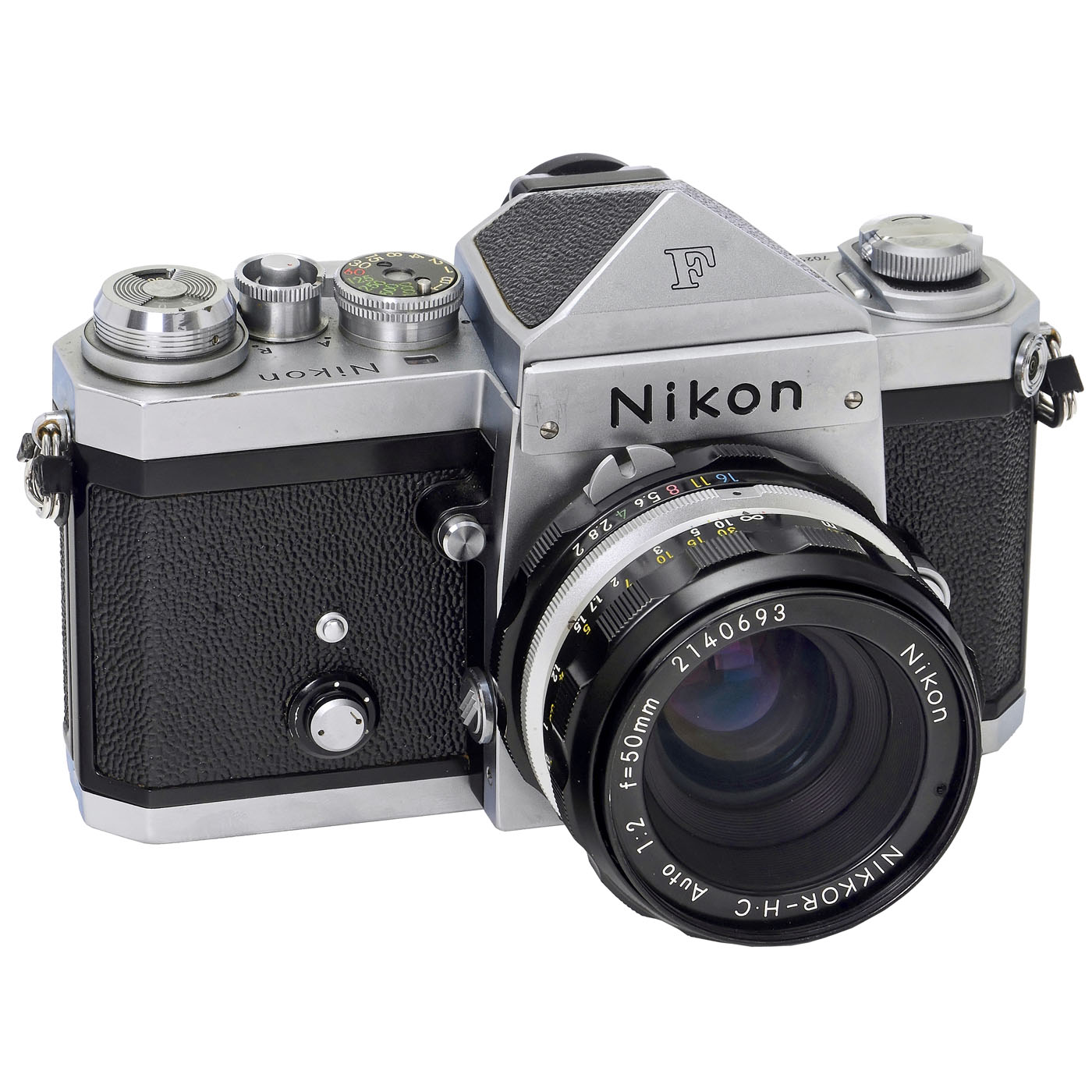 Nikon, Japan. No. 7029451, chrome. Nikon's first 35mm SLR, built for professional use, with an interchangeable viewfinder system and no self-timer lever. 24 x 36 mm format, titanium focal plane shutter at 1ÿ1/1000 sec., motor mount for F36 and F250. With Nikkor-HC Auto 1:2 f=50 mm, no. 2140693. A Nikon F variant in very good condition. Nikon provided this version of the Nikon F free of charge to war correspondents during the Vietnam War. This was Nikon's breakthrough in the professional field. ÿ In addition: "Das Nikon Handbuch" by Peter Braczko, 1st edition from 1990.