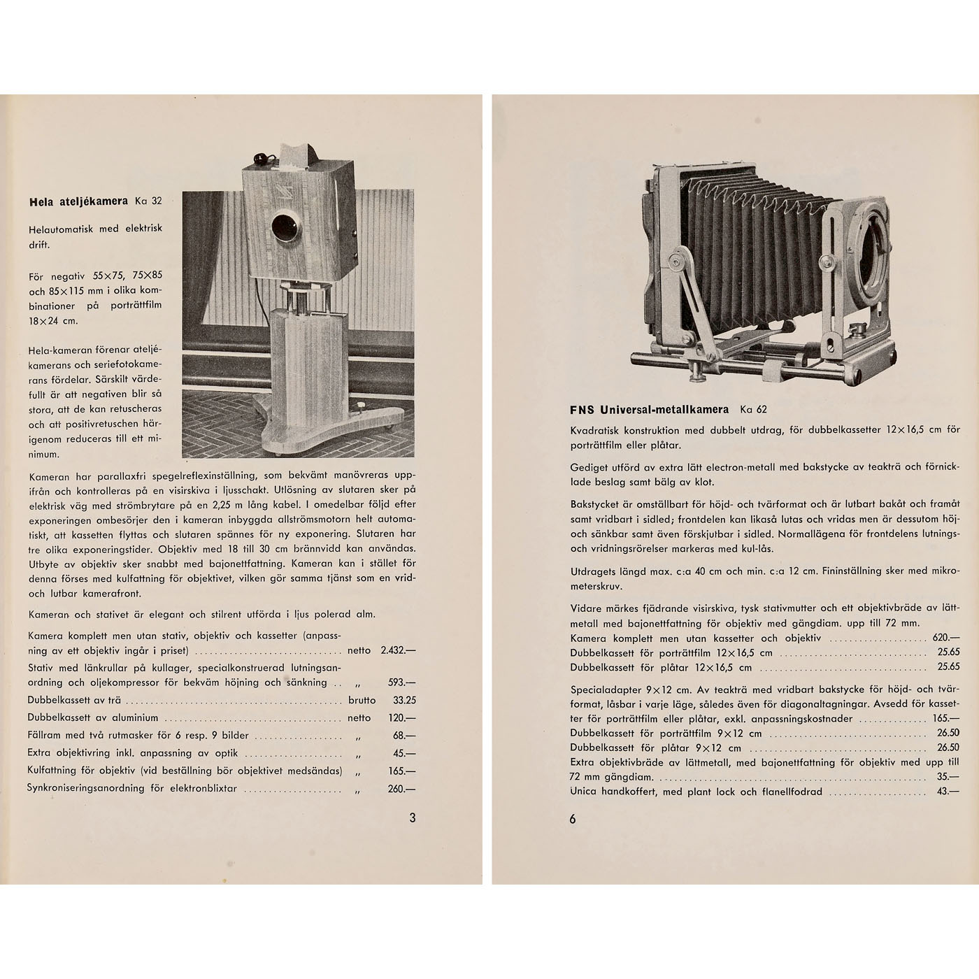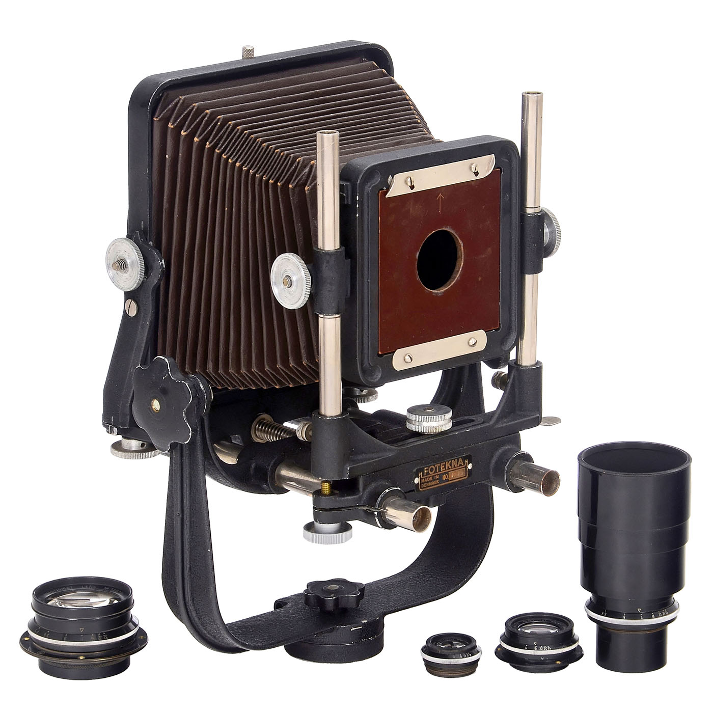 1) Fotekna, Denmark. Fotekna no. 3075, c. 1945, optical bank camera for 91 x 116 mm sheet film format, focusing of the 26 cm long double rod via a central drive, front can be adjusted up and down as well as on two axes. With a 94 x 94 mm plate, a Cooke set suitable for this camera with this focus was intended: Taylor-Hobson, London. All lenses are coated and good to clean under point light: Cooke Wide-Angle Anastigmat Series VIIB 6.5/108 mm and 6.5/158 mm (with screw-on ring), Cooke Aviar Series II 4.5/210 mm (with screw-on ring), and Cooke Telephoto Anastigmat Series VIII 5.6/320 mm. (3+/3) ÿ 2) Danish photo catalog 1951, 221 pages, on page 6 the successor to the Fotekna as the FNS universal metal camera, and very interesting on page 3 is the previously unknown futuristic studio camera "Hela" with electric operation. ÿ And: 3) Mamiya, Japan. Mamiya Super 23, professional 6 x 9 cm rangefinder camera with interchangeable Sekor 3.5/100 mm, with lens hood, two 6 x 9 cm magazines, and four sheet film cassettes. (3-/3+)