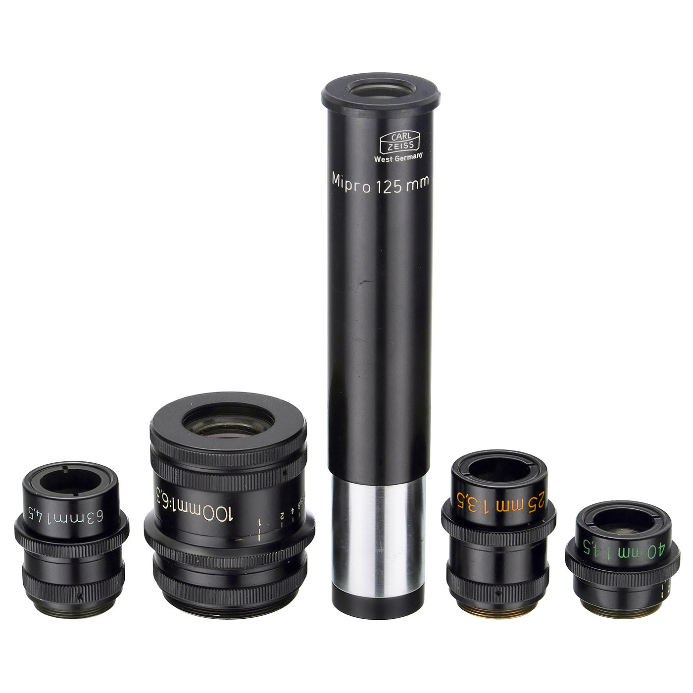 Carl Zeiss, Oberkochen. All with iris diaphragm, all still without Luminar designation. 1) 3.5/25 mm no. 4127793, clean under point light. (2-/2) ÿ 2) 4.5/40 mm no. 4046151, clean under point light. (2-/2) ÿ 3) 6.3/100 mm no. 2153602, clean under point light. (3/2-) ÿ 4) 4.5/63 mm, slight fog on the inside under point light. (3/3) ÿ And: 5) Eyepiece "Mipro 125 mm KPL", clean under point light. (3/3)