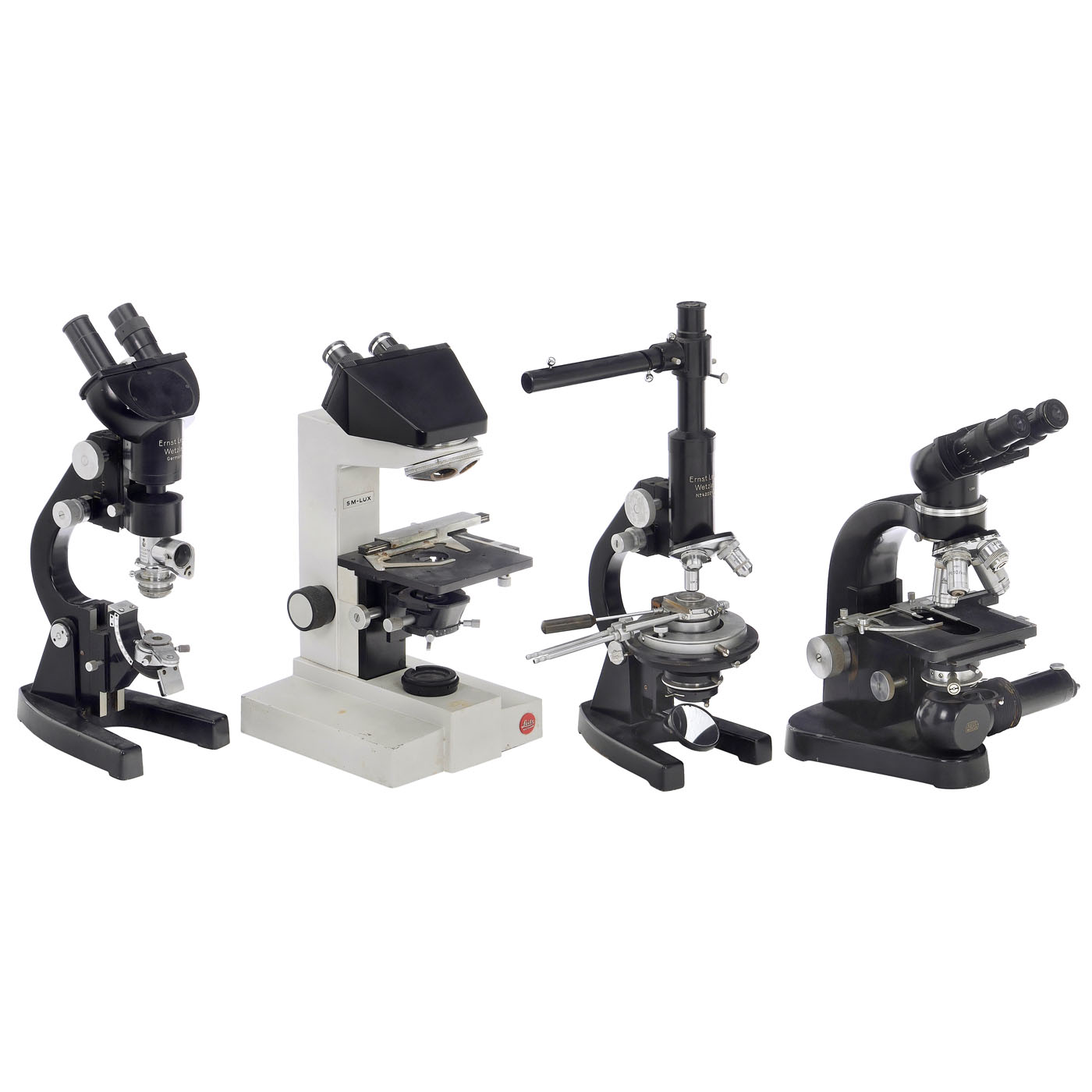 Wetzlar. 1) Laborlux SM, binocular microscope, no. 496227, 1956, electric illumination, condenser, rectangular stage, quadruple turret with objectives, binocular tube l.25x, height 36 cm.