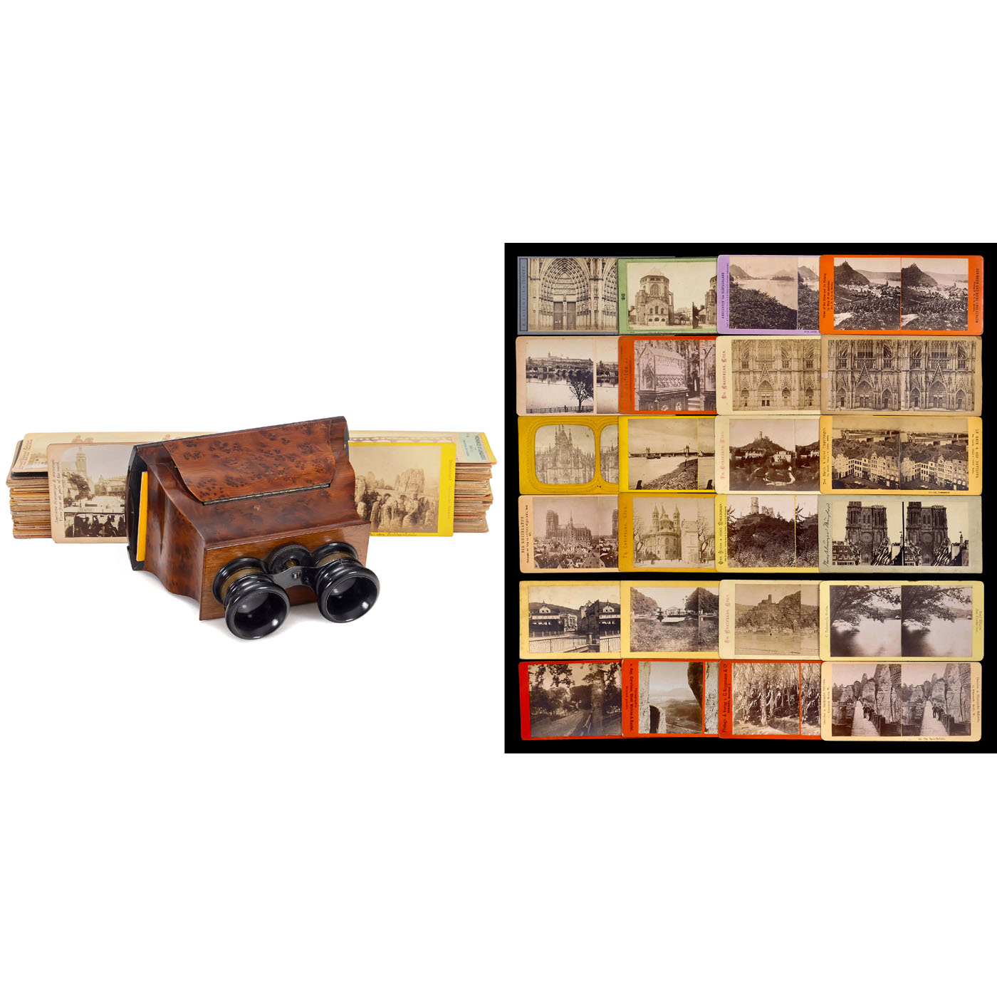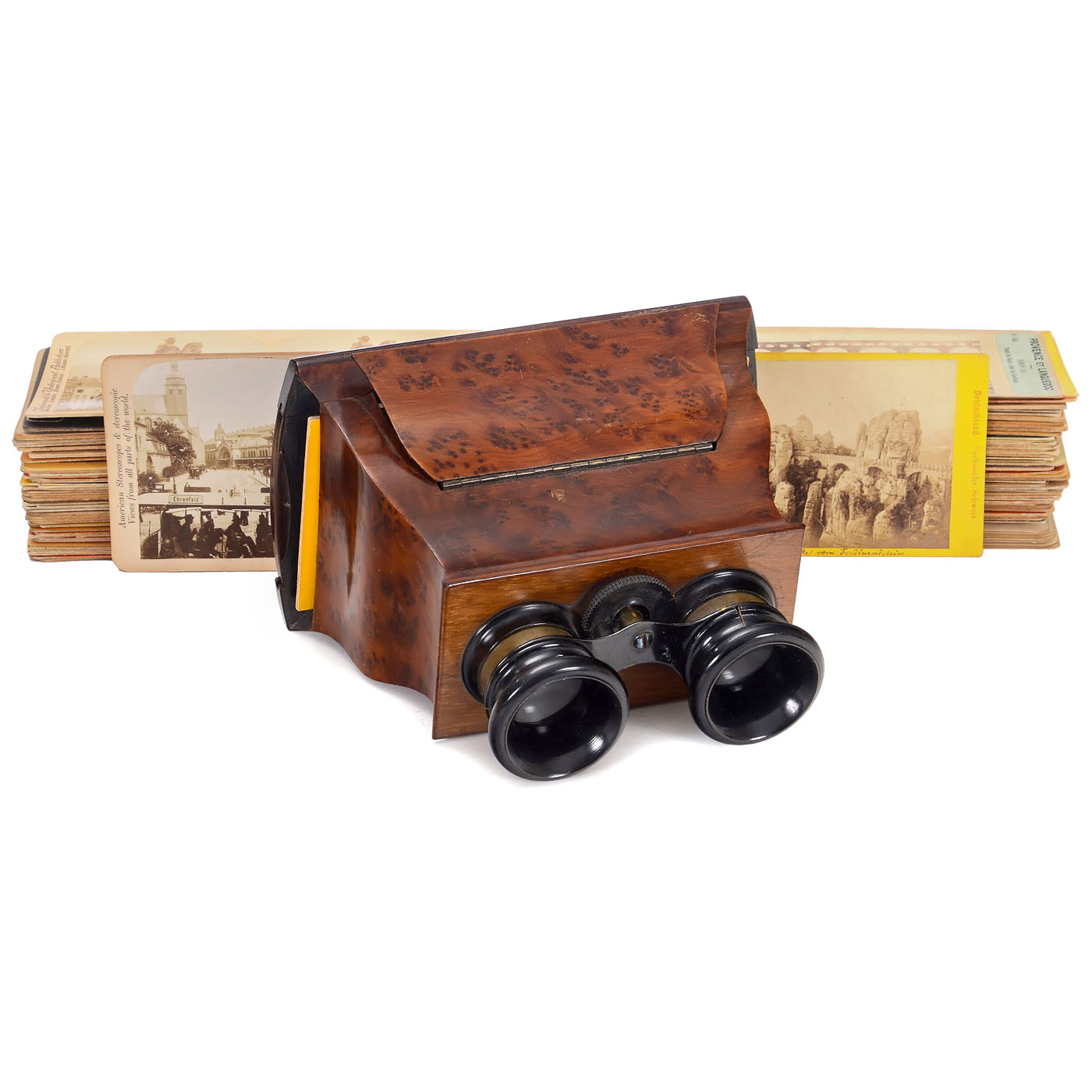 All stereo cards for 9 x 18 cm, in varying condition, but without major flaws. 1) Stereo viewer, elegantly shaped, curved housing with burl wood veneer, focusable eyepieces, with mirror flap. (3/3)