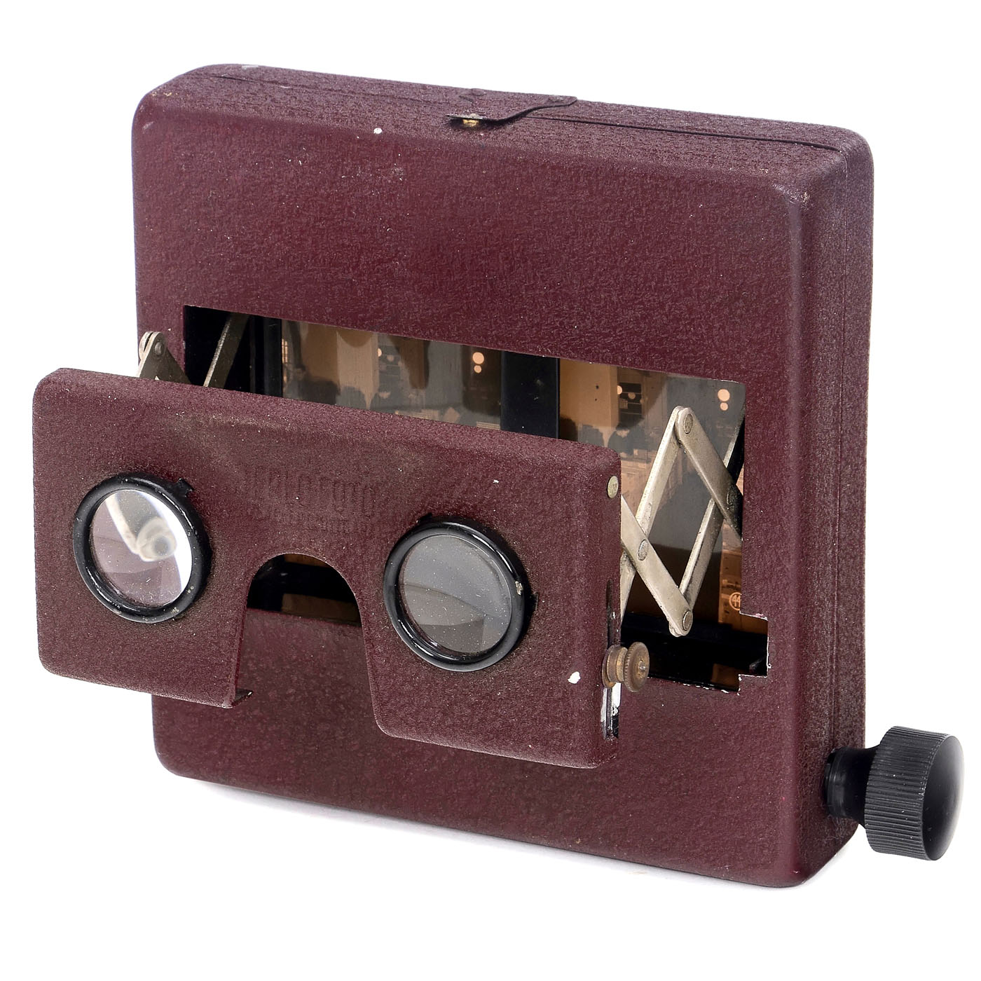 Weizs?cker, Stuttgart. Foldable rollfilm stereoscope, with a 12 cm wide, interchangeable film strip inside with 54 stereo images, featuring excellent explanatory images of the manufacturing process for lenses and cameras at Voigtl?nder in Braunschweig during the early 1950s. Viewing the images is possible with a little assistance. Looking at these images reveals the answer to the question "Why is this lens so good?", and, in particular, why the merger with Zeiss occurred, thanks to this dedicated workforce. Some manufacturing steps have never been illustrated in technical literature before. The series begins with a test projector, then glass block sawing, thickness measurement, polishing, lens element assembly, grinding, precision polishing under protective cover, testing, assembly, lens mounting, painting, a test room with four collimators, a lathe department, an assembly hall, stamping, machining, drilling, milling, electroplating, metal polishing, painting, drying, final assembly, stamping, engraving, testing, final inspection, packaging, and a display case for the production line. From the golden age of the German economic miracle!