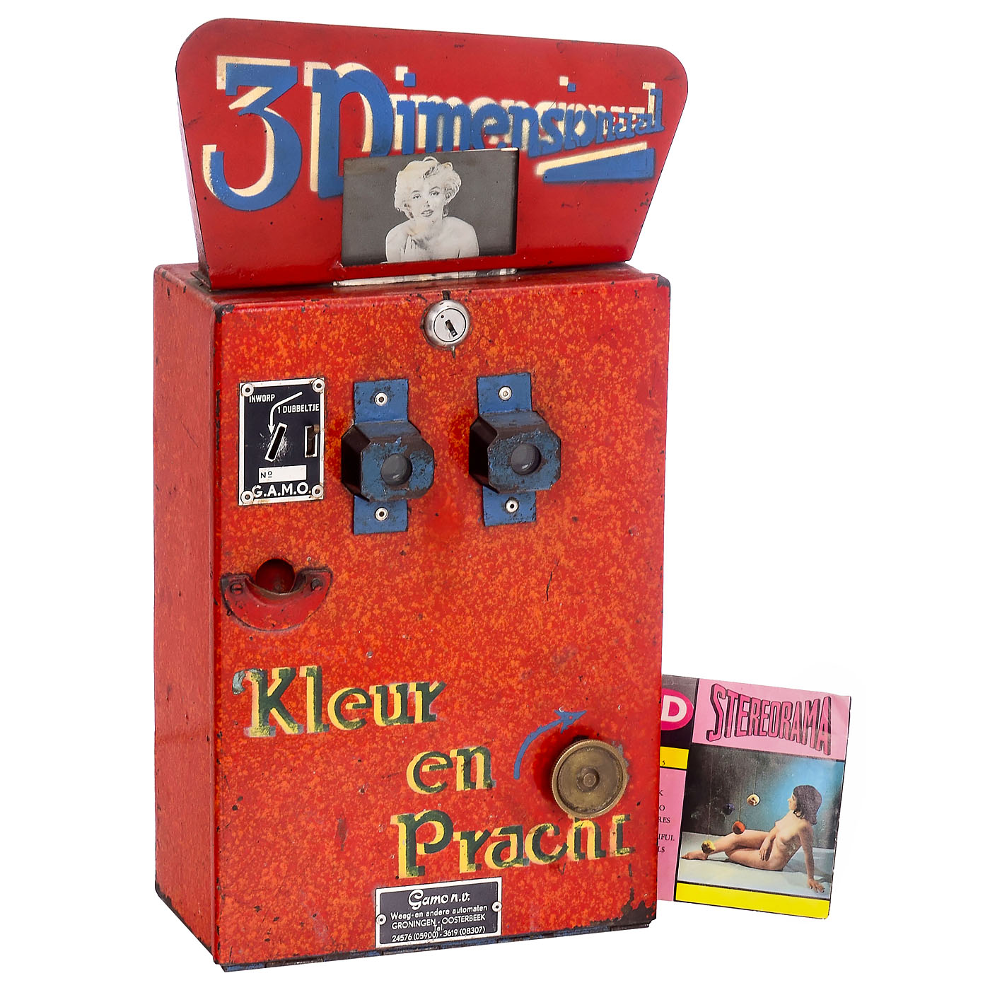 Gamo N.V., Netherlands. "3Dimensionaal Kleur en Pracht" (Color and Splendor), red-lacquered metal housing, originally equipped with a photo of Marilyn Monroe as a display. Built-in is a Sawyer's View-Master Model C viewer (1946