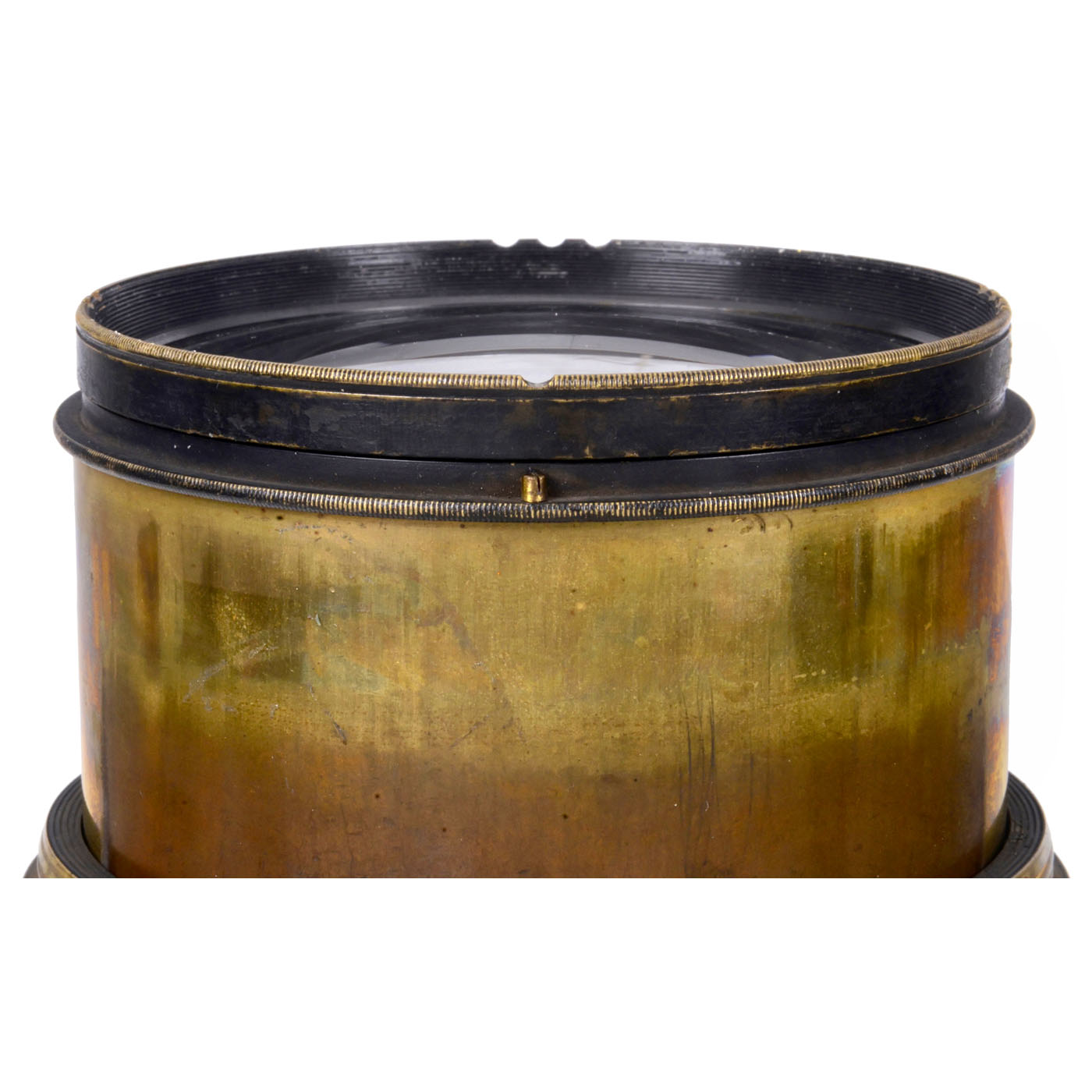 J.H. Dallmeyer, London. No. 27657, focal length approx. 11 in., for Waterhouse stops (with one for stop 11.3), height 8 in., front element ? 8,9 cm, rear lens with smoothly movable soft-focus adjustment, glass clean under point light, front lens has a cementing defect about 2 mm wide on one third of the outermost edge (of no importance for the application), all lens parts movable, lens hood with some dents.