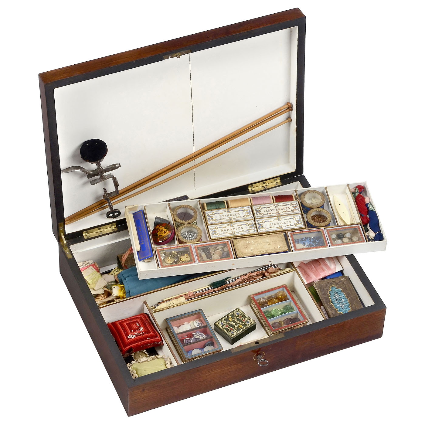 Alph. Giroux et Comp.ie, 43, Boulev. des Capucines, Paris. Sewing box inlaid "Travail" (work or handywork) in brass on the lid, dimensions: 40 x 30 x 9.5 cm, inside filled with contemporary sewing utensils.